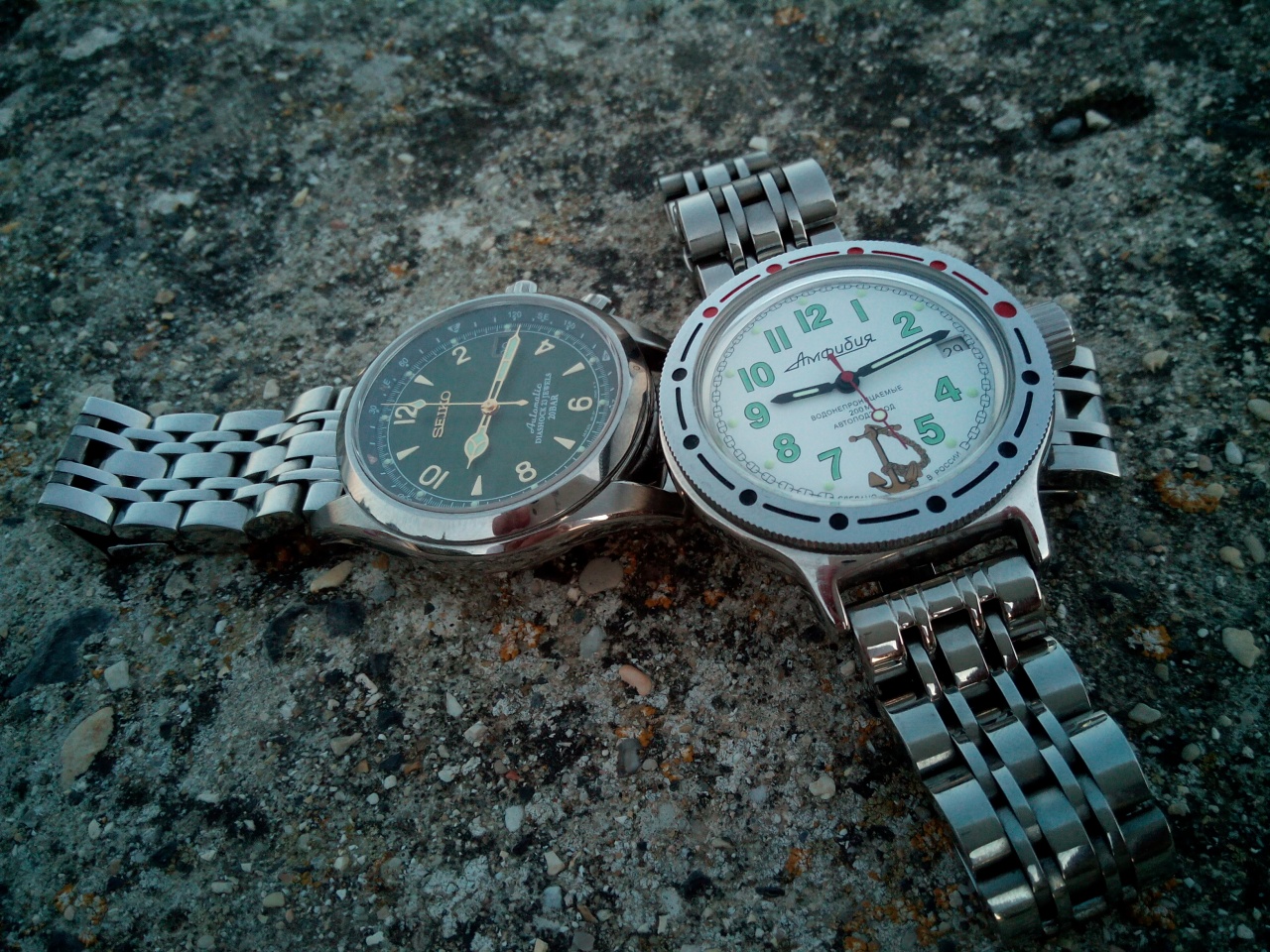 В своё время я долго искал идеальные для себя часы. Пришёл к Seiko Alpinist (green) sarb017 и подумал - вот одни и на всю жизнь. Перед этим временно идеальными до Альпиниста у меня на ремешке Hirsh были Seiko 5 Sports SNZG09J1. А первыми для меня серьёзными и дорогими часами за 11 000 с чем-то рублей были (до всех других часов) Skagen 759LRLD - на мой взгляд с уникальным дизайном. Жаль, что только 30 м. Поэтому избавился. Ну потом случайно увидел Orient Blue Mako EM65002D, ничего о них не зная, оценил и влюбился, и без моей помощи они стали вторыми часами к Альпинисту. Потом Orient Retrograde (на которые у меня не было денег) мне заменили Orient privately Retrograde (F)EZ09005W, ну и в итоге Hamilton (в чём-то замечательные, но не до конца законченный всё ж дизайн у Hamilton) мне заменили, и с огромным успехом (так как именно их мне приятнее всего носить и носятся дольше всех), Восток Амфибия 420381. Одно время я даже не знал, что механика может быть 200 м и, о ужас, у меня недолго были кварцевые Tissot 200 м! В общем путь и эволюция были тернисты, всё, не поверите, находил сам, даже Мако и Альпиниста, не зная их легендарности и не зная этого форума. Приятно потом было узнать об их популярности. В общем в рамках бюджетных вариантов предлагаю делиться информацией (модель, фото, основные характеристики (сапфир/мин., WR, источник энергии), примерно цена) об интересных недорогих часах с уникальным сочетанием дизайна, цены и параметров - как Мако - механика, 200 м, чудесный дизайн, невысокая цена. Чтобы человек в поисках не проходил сложный путь и долгий с мучениями, а зашёл бы сюда, и за час чтения темы выбрал бы себе пару или тройку отличных моделей. Почему недорогих - потому что среди дорогих часов, понятно, проще найти хорошие часы сразу и по дизайну и по параметрам.