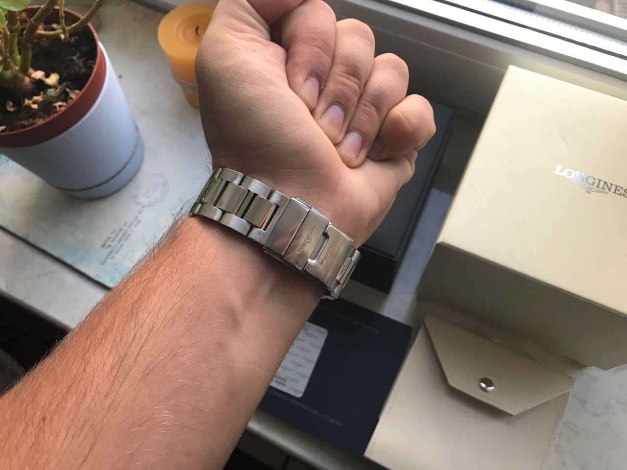 Полный комплект с коробками и документами. Браслет полный. Состояние отличное. Не полировались, и это совершенно не требуется, как по мне.