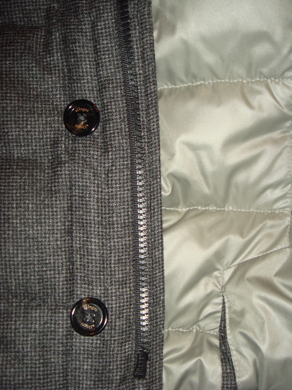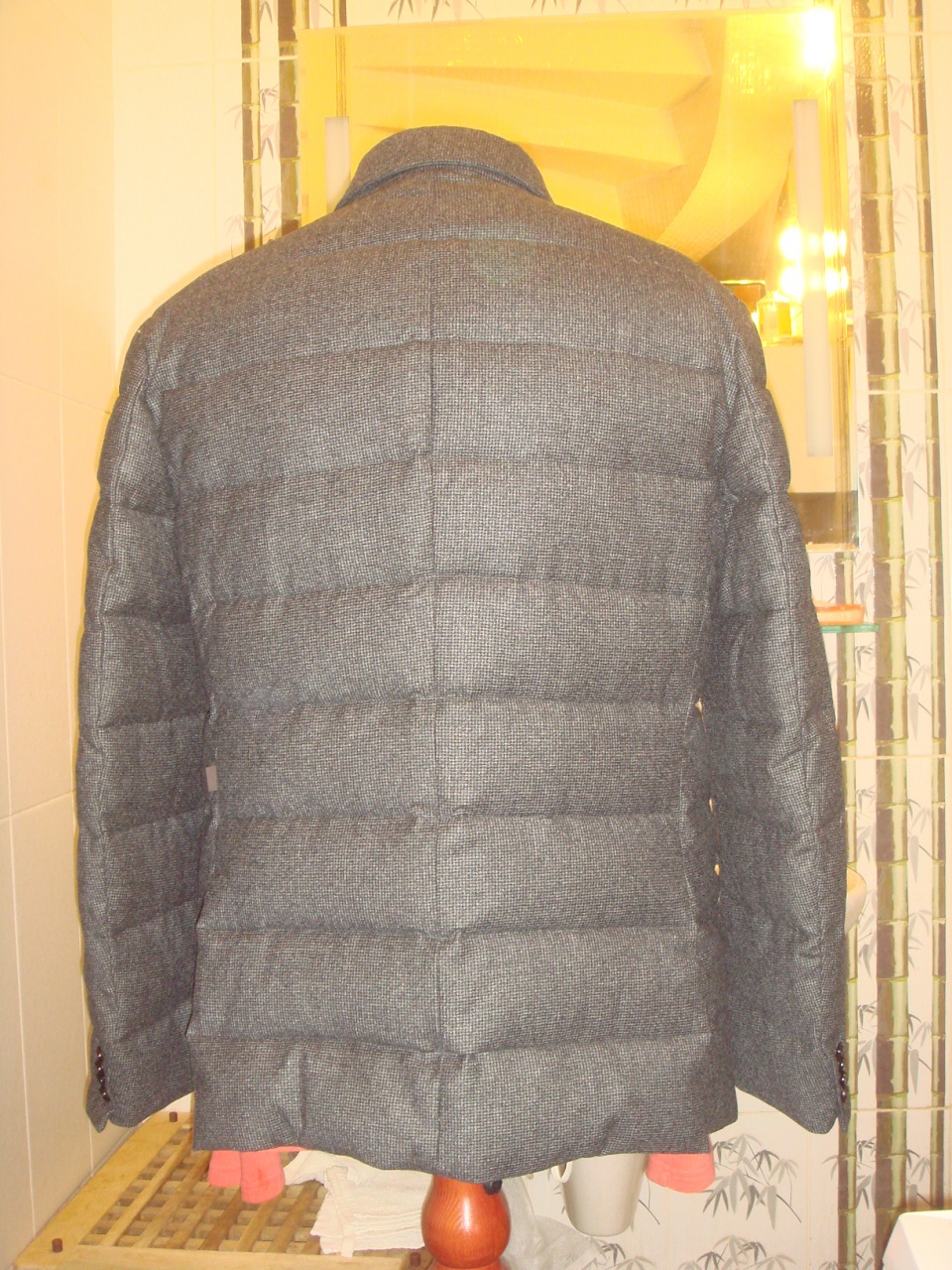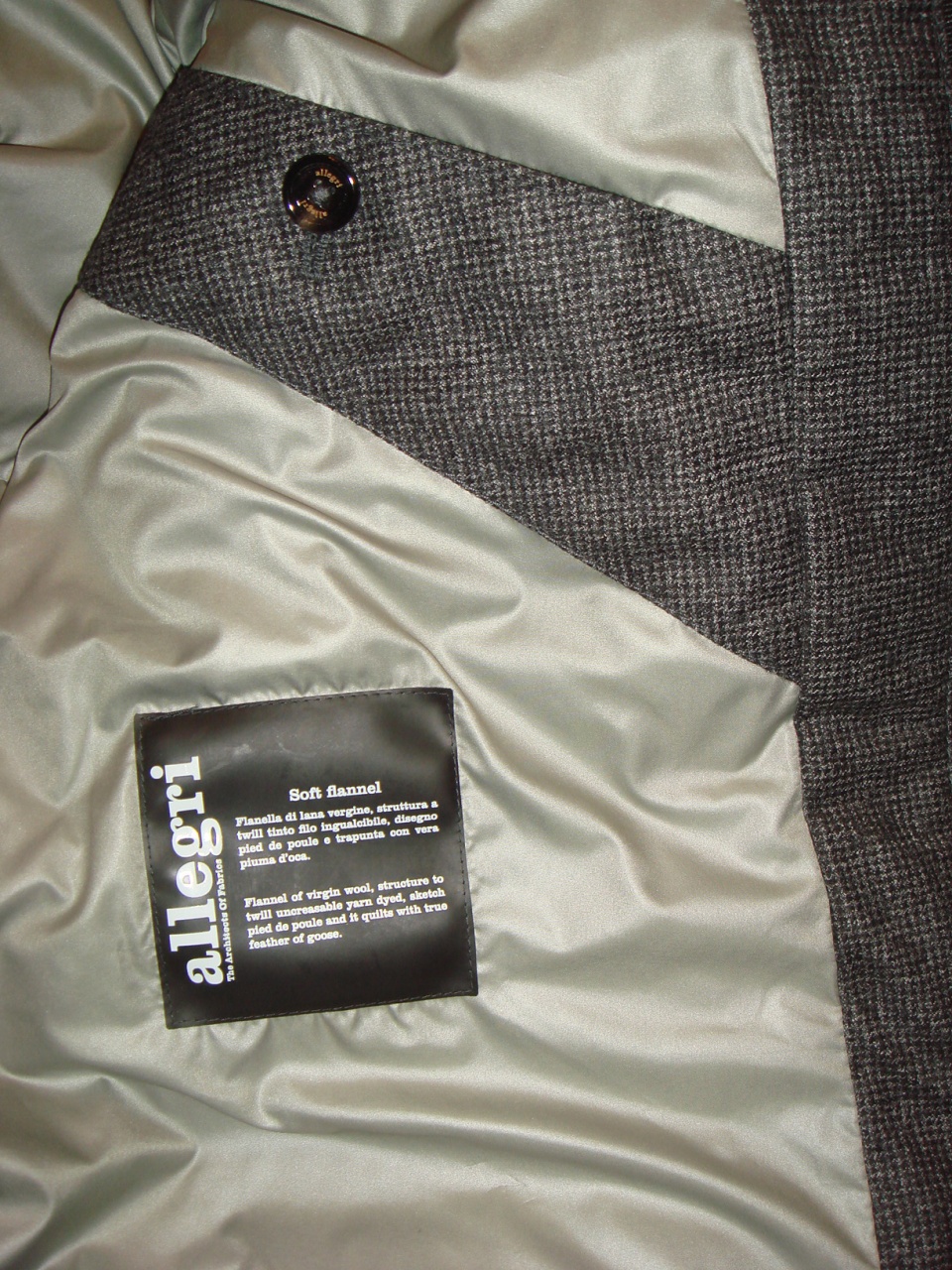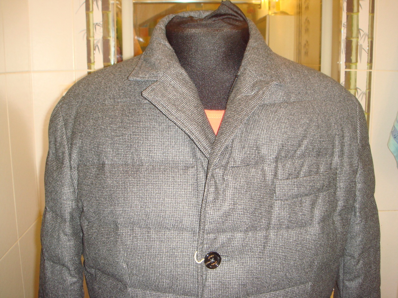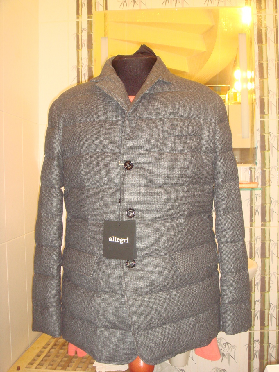 Продается новый мужской пуховик итальянского бренда ALLEGRI . стилизованный под пиджак , простеган с двух сторон, превосходного исполнения, серого цвета, ткань пропитана водоотталкивающим составом, воротник с лацканами , однобортная модель, 3 пуговицы с логотипом бренда, двух ходовая молния, 2 накладных кармана , внутри на гусином пуху , два внутренних кармана на пуговицах, манжеты на пуговицах с логотипом бренда, сзади два шлица на кнопках, состав : 100% шерсть ( Lana Virginia), все бирки прилагаются , гарантированный 100 % оригинал , размер 54(IT) , российский размер 52