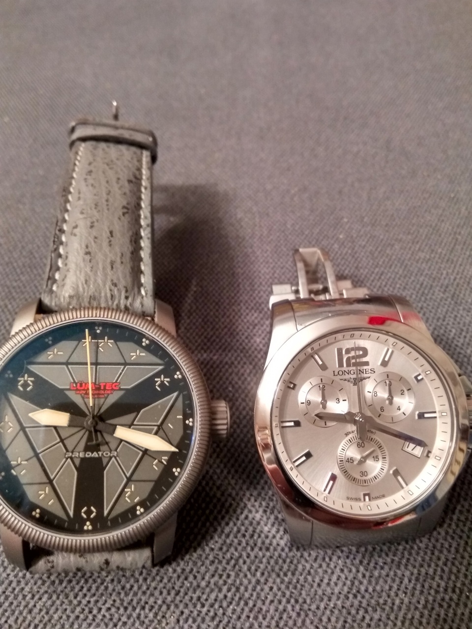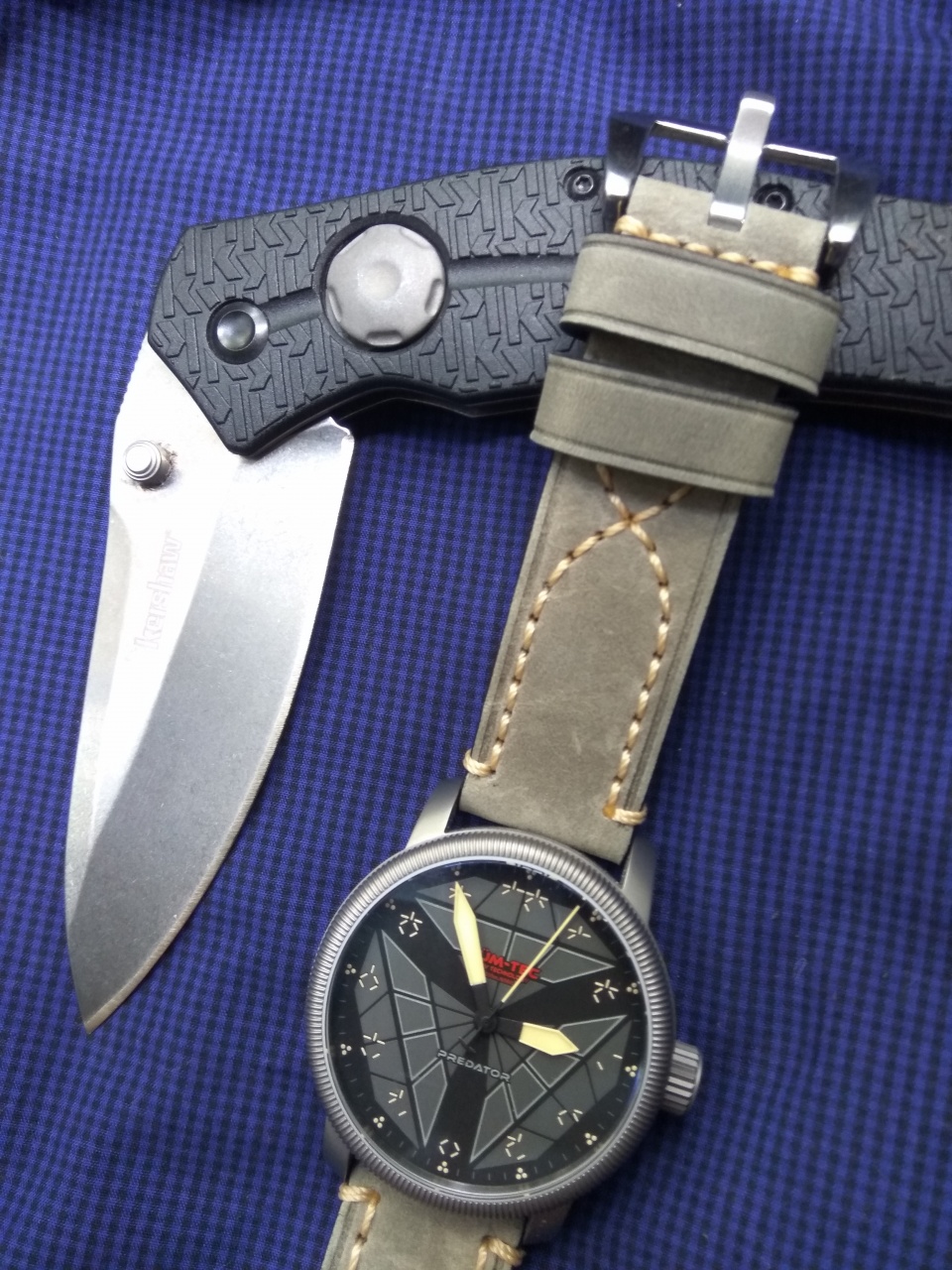 В комплекте 2 ремешка в стиле Nato»: черный текстильный и коричневый кожаный.