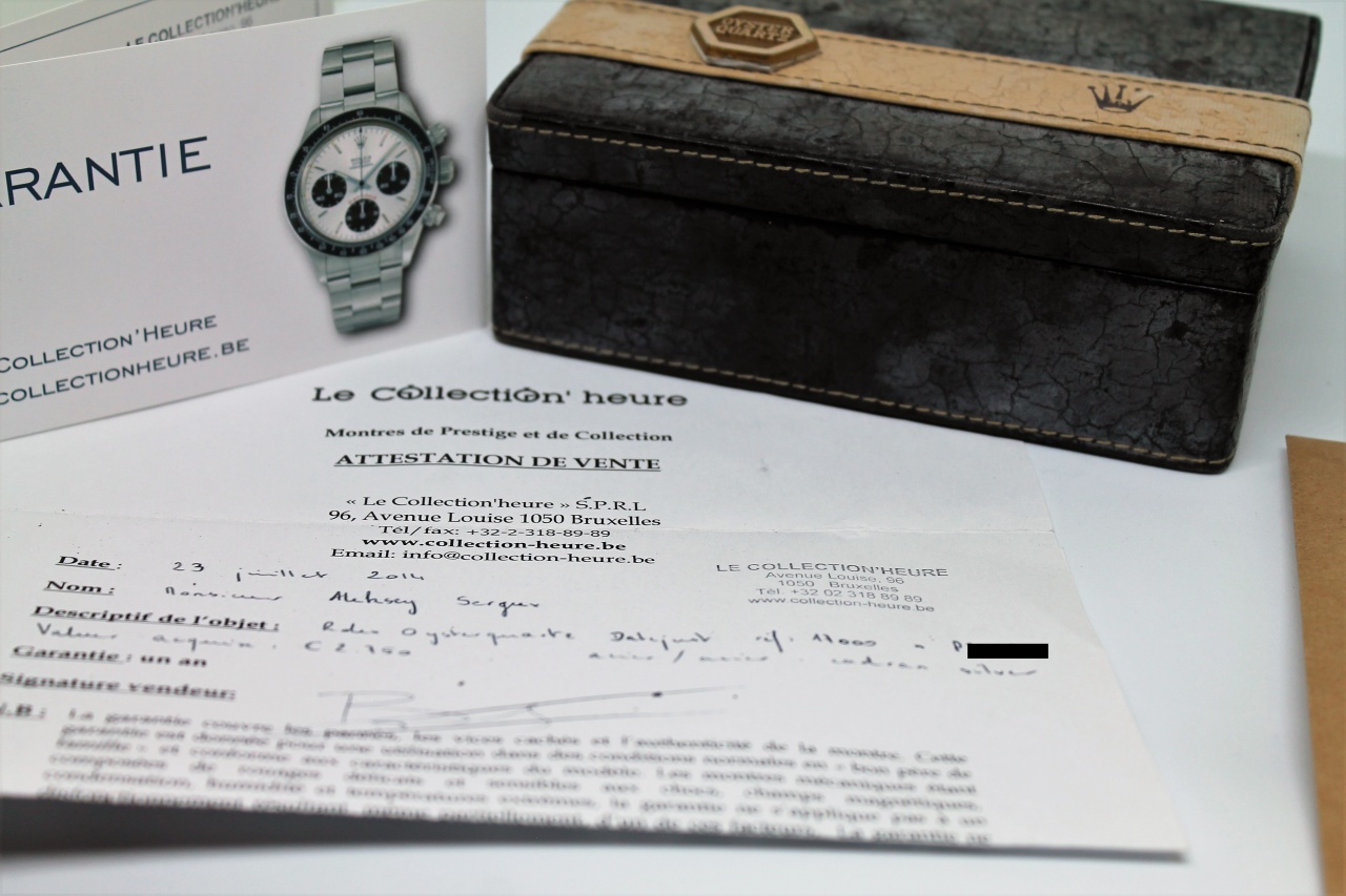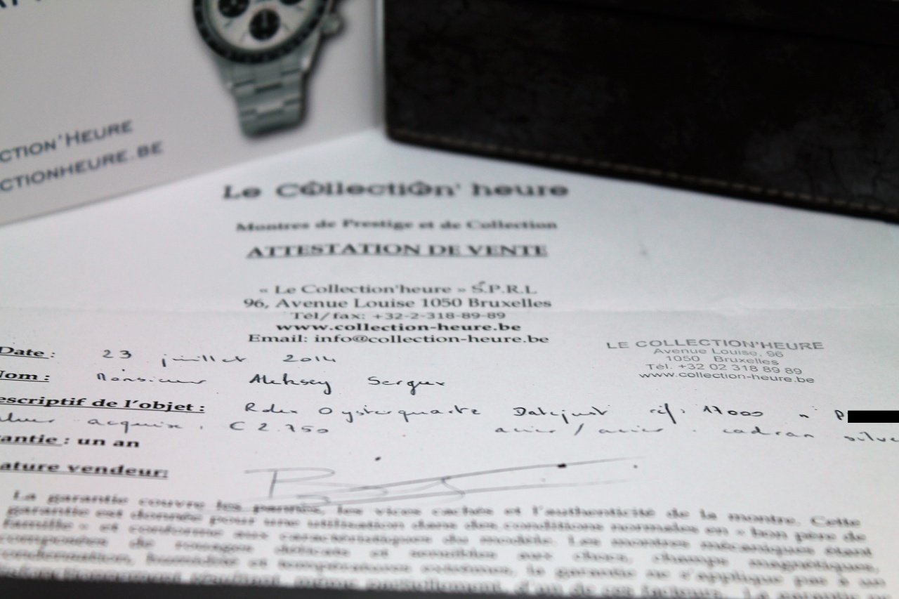 В комплекте "аутентичная" коробка, сертификат и гарантийное письмо ломбарда с хроно. Цену поставил на мой взгляд достаточно адекватную, конечно с пространством для торга и запасом для снижения(на известных мне и вам ресурсах цены начинаются с 2900-3000 usd за экземпляры в гораздо более удручающем состоянии и комплекте)...