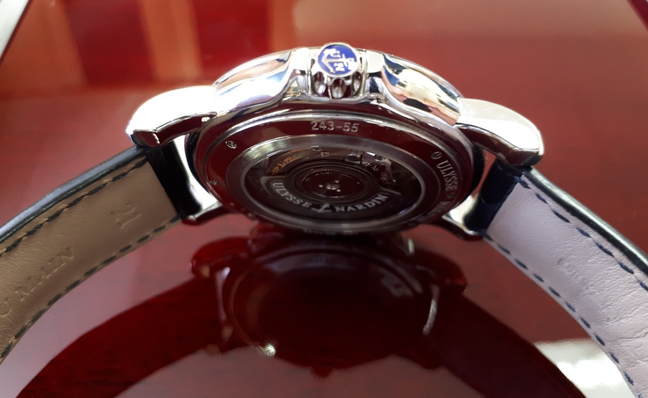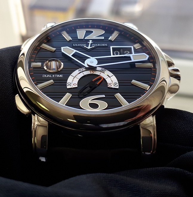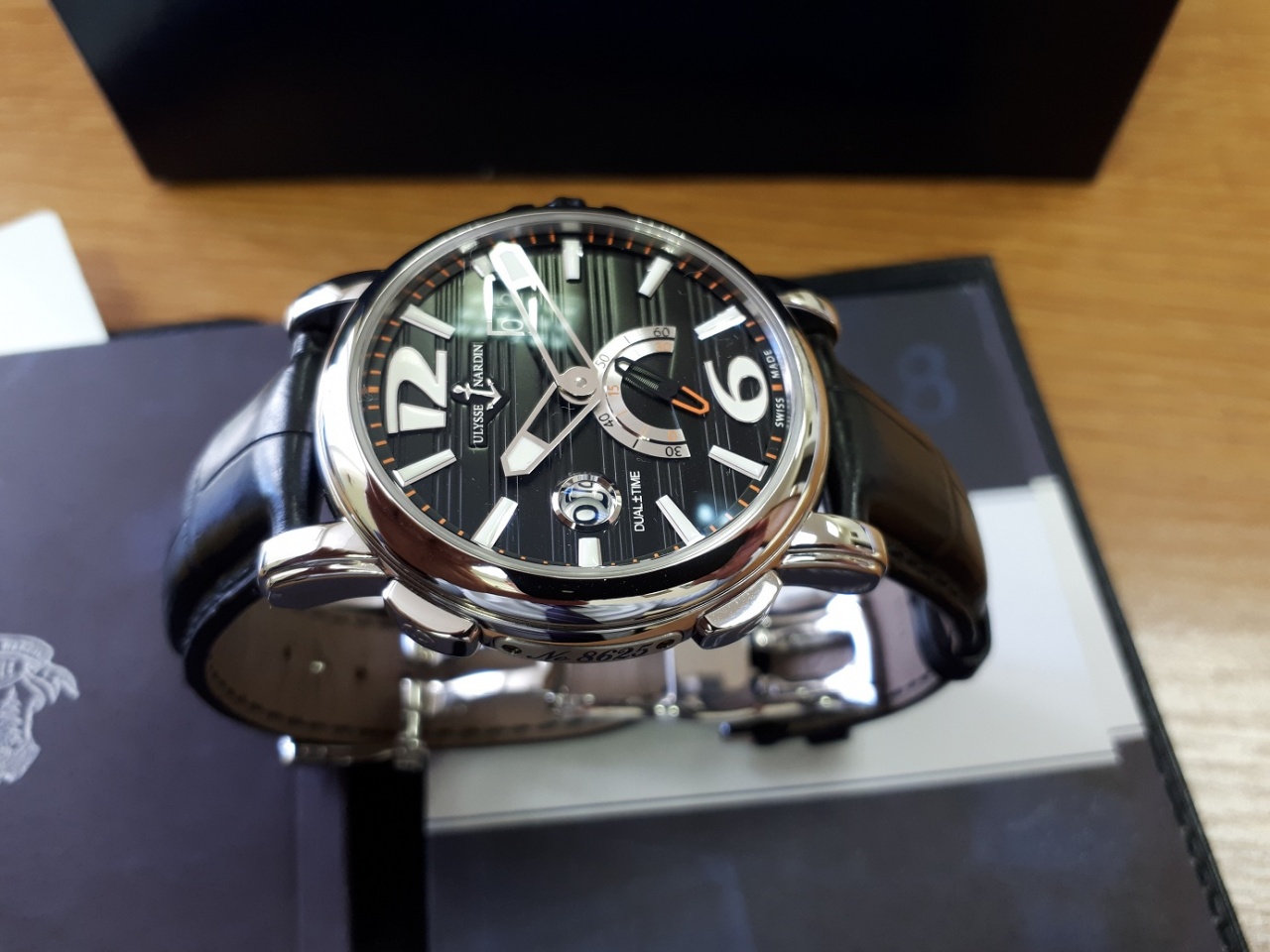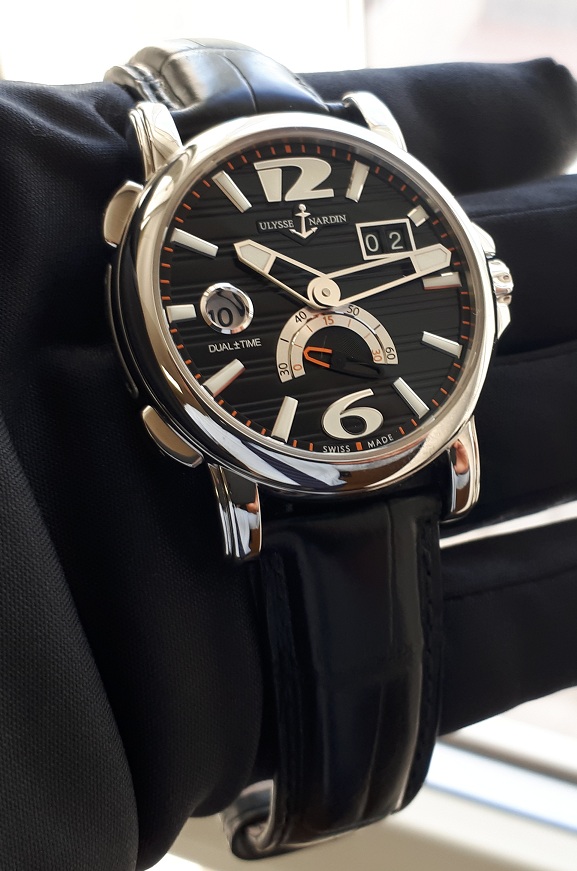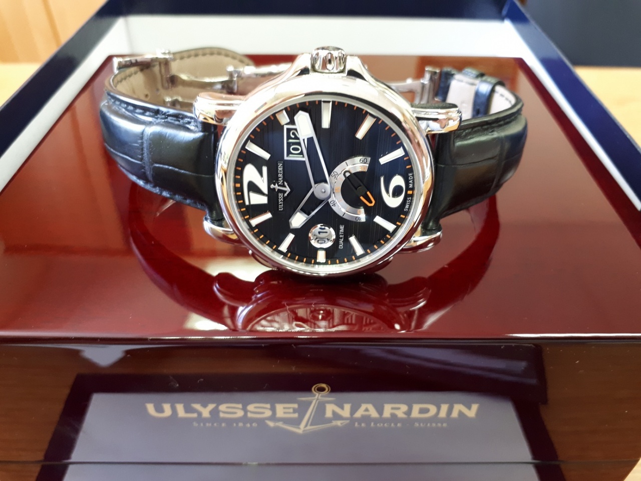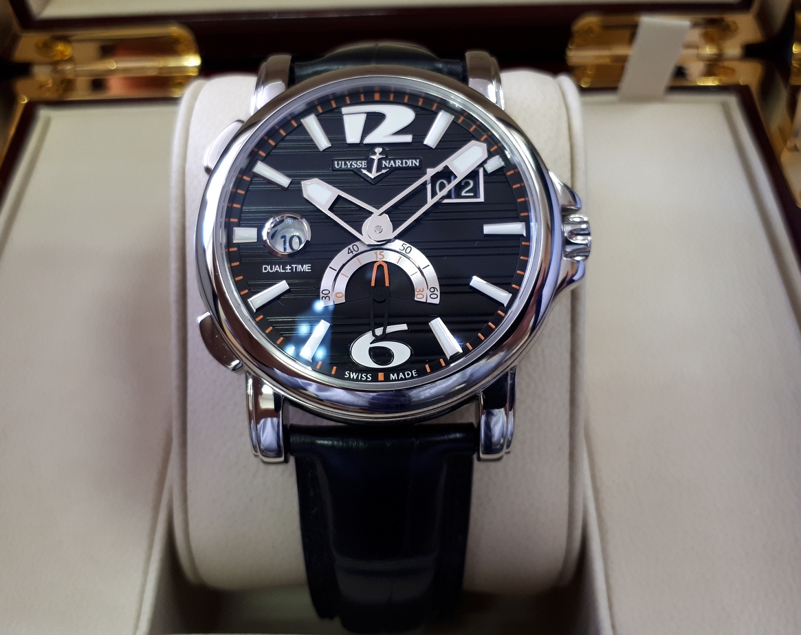 Модель Ulysse Nardin Dual Time 42mm, поражает красотой циферблата. Уникальный механизм быстрой коррекции времени, индикатор постоянного «домашнего» времени, большой указатель даты. Фиксируемая на резьбе заводная головка.