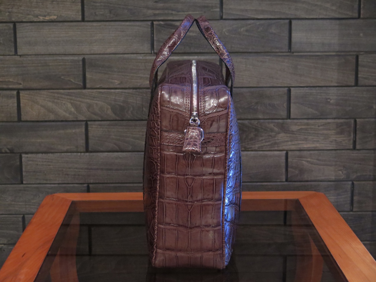 Сумка застёгивается на молнию с с фирменным бегунком из кожи крокодила и имеет два внешних боковых кармана для небольших документов, или сотового телефона..