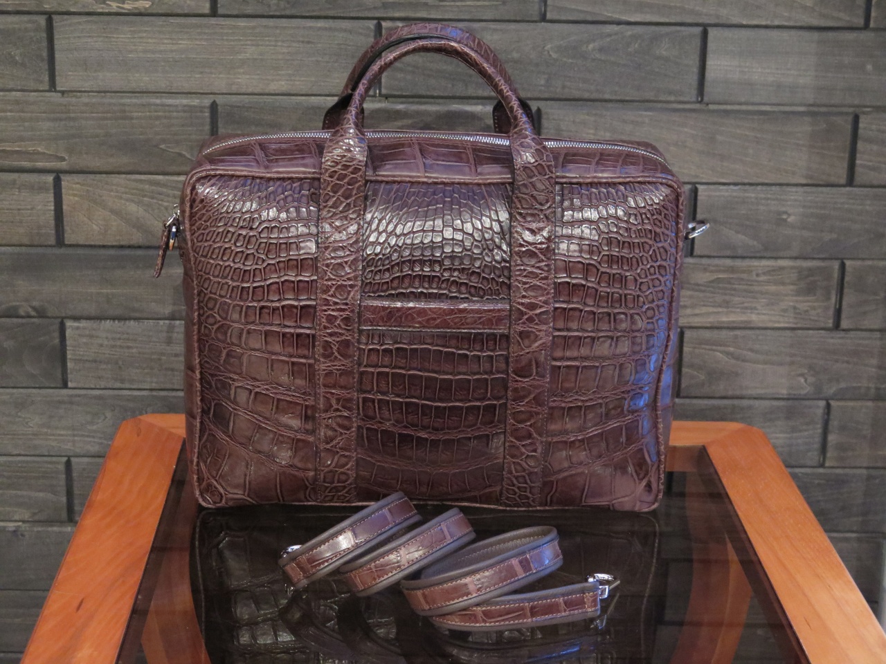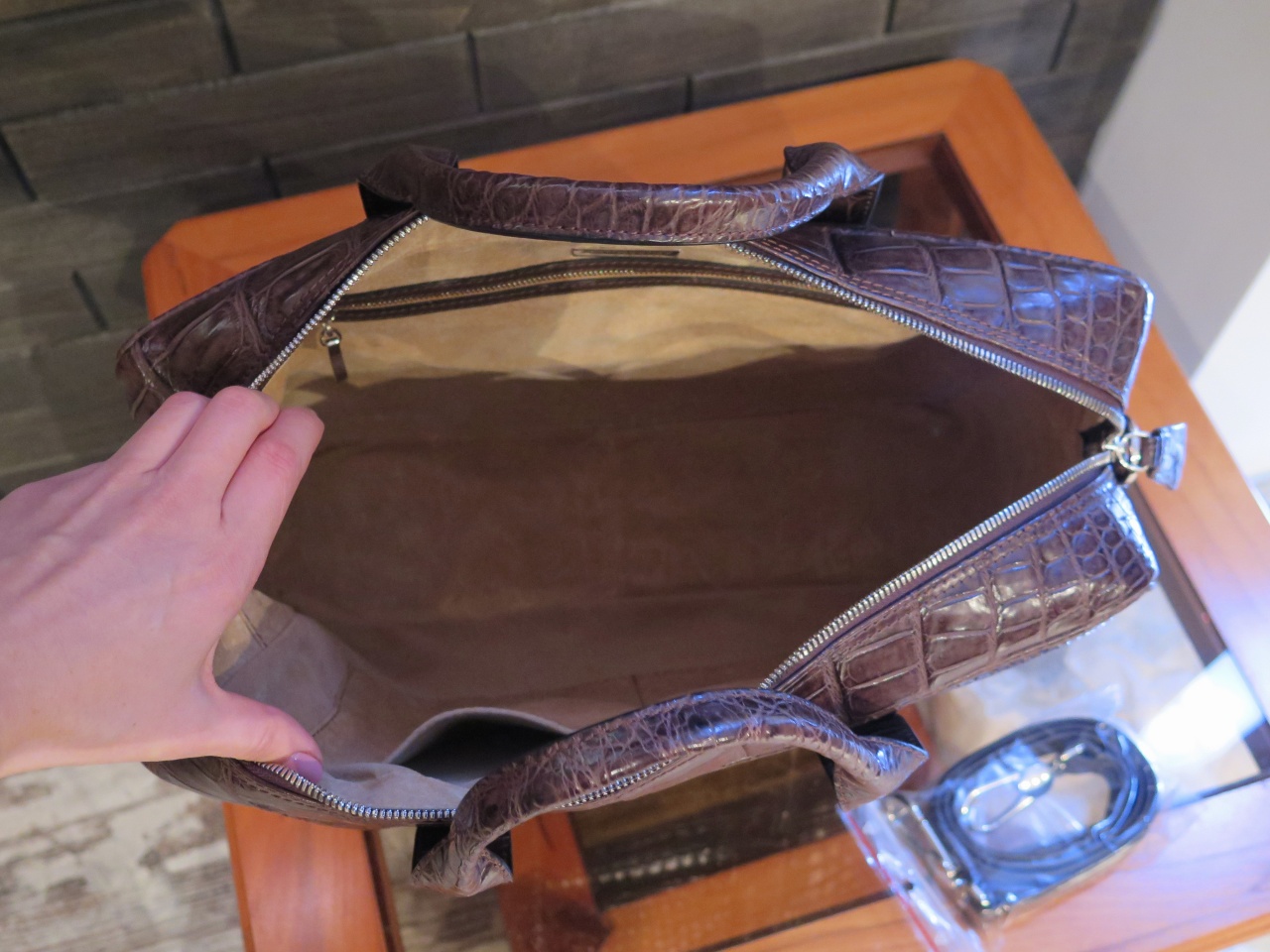 В комплекте к сумке прилагается регулируемый плечевой ремень из телячьей кожи с отделкой из кожи крокодила коричневого цвета.