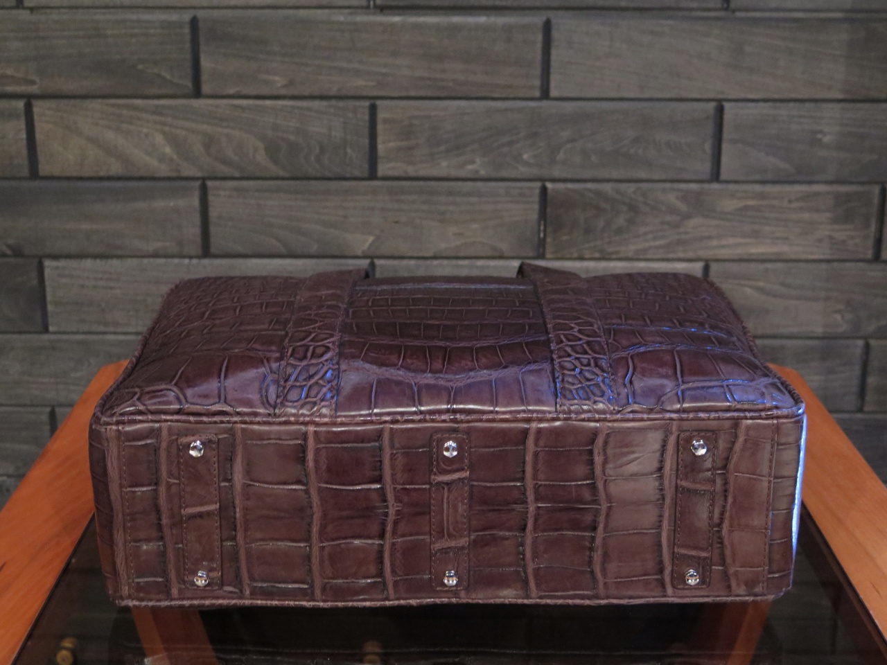 Детали и декоративные элементы сумки изготовлены из никеля, покрытого палладием. Сумка изготовлена из 100% кожи нильского крокодила высочайшего качества выделки с полуматовой поверхностью.