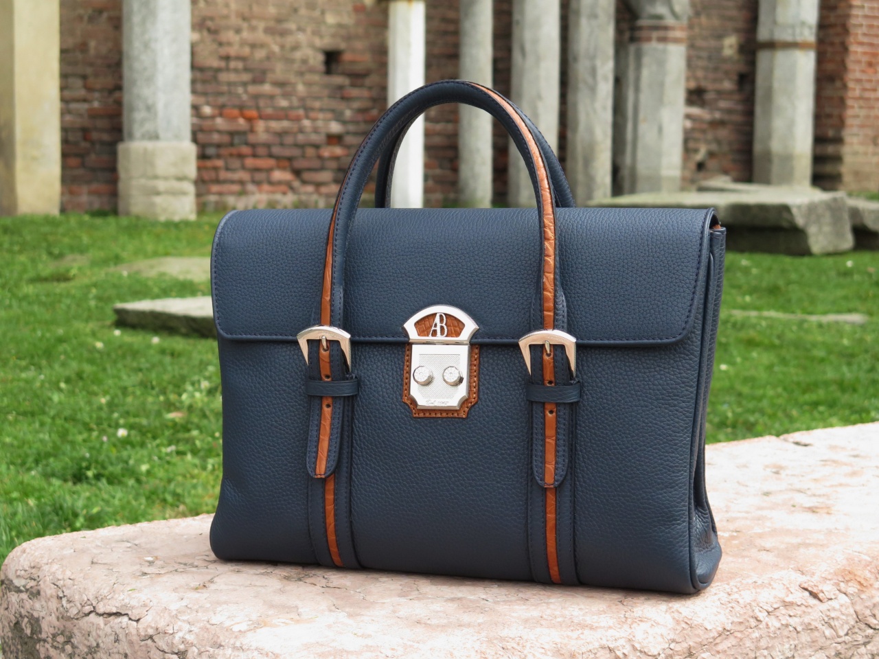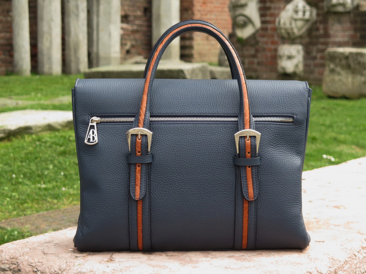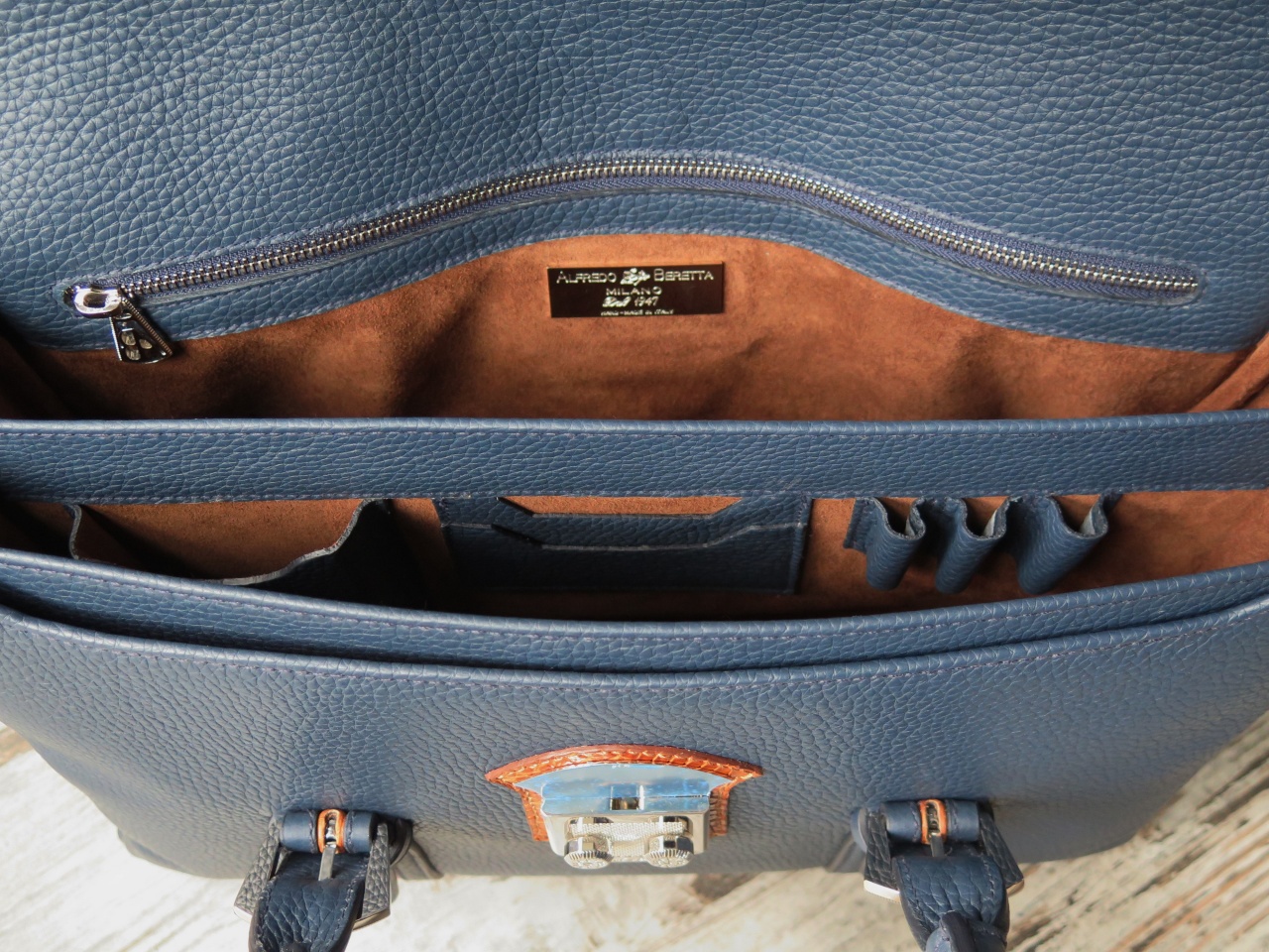Сзади портфель имеет внешний карман, застёгивающийся на молнию с фирменным металлическим бегунком марки с инициалами "AB". Внутренняя часть портфеля изготовлена из 100% замши латиноамериканских пекари коричневого цвета, и имеет два больших отделения для переноски документов, ноутбука и прочих вещей, отделение на магнитных кнопках, дополнительное отделение, застёгивающееся на молнию с бегунком, и кармашки для хранения 3 ручек, смартфона, визитных карточек, изготовленные из кожи буйвола. К портфелю прилагается сертификат мануфактуры "Alfredo Beretta Milano dal 1947", подтверждающий подлинность изделия.