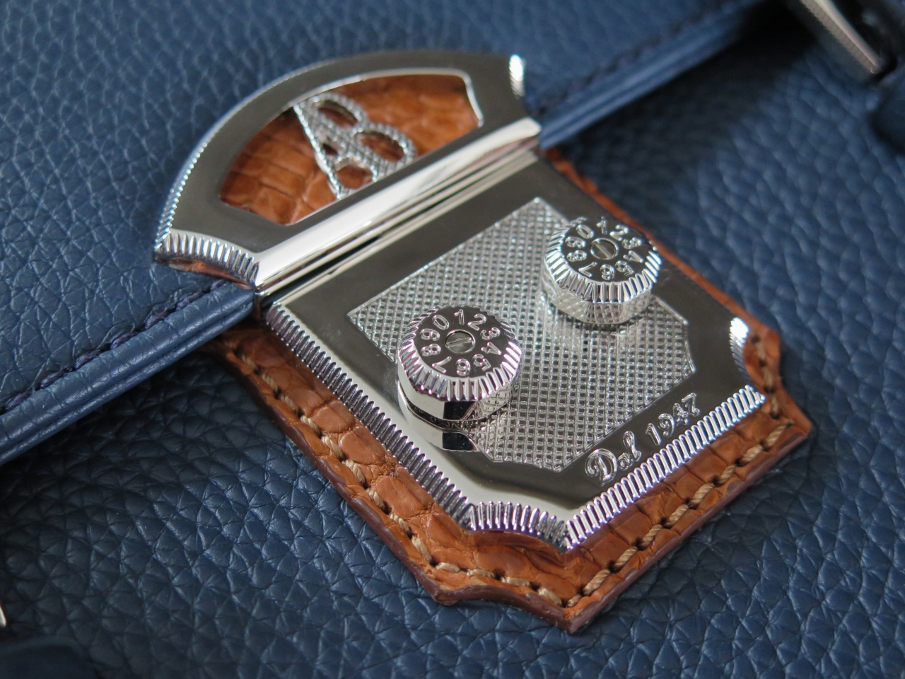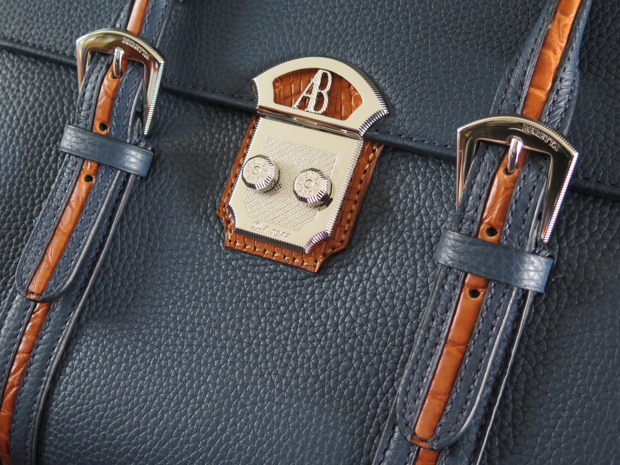 Портфель снабжен двумя ручками-"ремешками" с фирменными пряжками с надписью "Beretta", регулируемыми по длине. Декоративная отделка ручек и замка портфеля выполнена из 100% кожи миссисипского аллигатора светло-коричневого цвета. Портфель застёгивается на фирменный кодовый замок "Alfredo Beretta", предусматривающий возможность изменения кода. Детали и декоративные элементы портфеля изготовлены из стали, покрытой палладием.