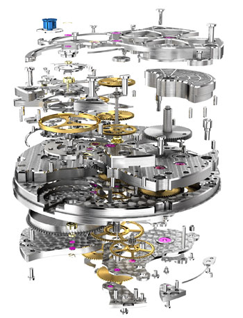Модель оснащена автоматическим механизмом RD78. Двухкнопочный хронограф с колонным колесом и с микроротором из сплава вольфрама. Калибр родированный, отлично отделанный, декорирован в стиле "Côtes de Genève". Состоит из 303 деталей, на 36 камнях, с балансовой частотой 28800 полуколебаний в час. Отмечен Клеймом Женевы (Poinçon de Genève ). Отрегулирован в пяти позициях. Запас хода 42 часа. Функции: индикация часов, минут (центральные стрелки), секунд (боковой циферблат на 9 часах). Секундная стрелка хронографа центральная, 45-минутный счетчик на 3 часах.