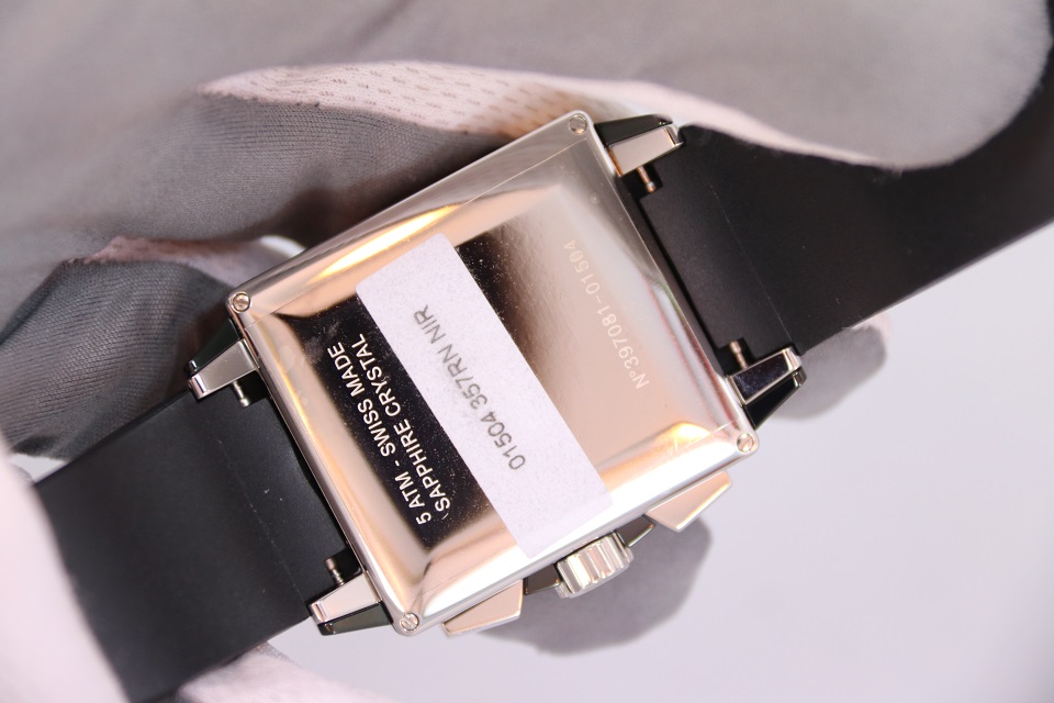 У часов необычная система индикации показаний хронографа: ретроградная центральная секундная стрелка; ретроградный пятиминутный указатель в правой верхней части циферблата; ретроградный часовой указатель в верхней левой части циферблата.