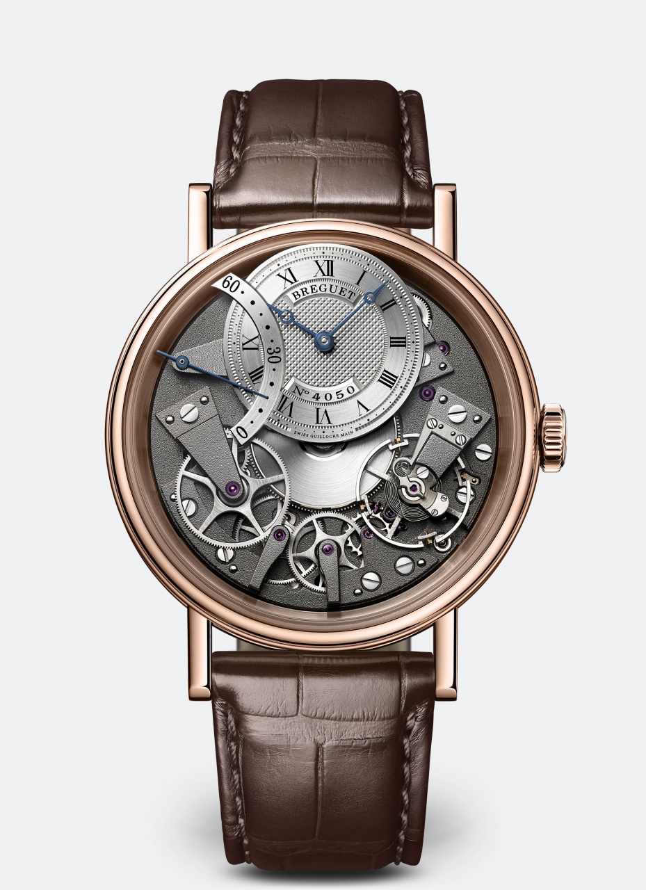 Легендарная коллекция Tradition, выпущенная в 2005 году, пополнилась новой замечательной моделью 2015 года: Tradition Automatique Seconde Rétrograde 7097, механическими часами с автоматическим подзаводом и ретроградной секундной стрелкой. Следуя лучшим традициям коллекции, эта модель подчеркивает техническое совершенство и красоту механизма, а также дает возможность полюбоваться мостами, колесами, спуском, барабаном и другими компонентами, которые обычно распологаются под платиной. Новая модель получила свое название в честь ретроградной секундной стрелки, дополняющей традиционную индикацию часов и минут на циферблате в положении «12 часов». Корпус: из 18-каратного розового золота с тонким рифлением на боковых поверхностях. Задняя крышка из сапфирового стекла. Диаметр: 40 мм. Приваренные ушки со стержнями с винтовой нарезкой. Водонепроницаемость до 3 бар (30 метров). Циферблат из 18-каратного посеребренного золота с гильошированным вручную узором, в положении «на 12 часов». Имеет индивидуальный номер и подпись «BREGUET». Часовая шкала с римскими цифрами. Ретроградная секундная стрелка в положении «на 10 часов». Стрелки из вороненой стали с наконечниками в форме яблока. Механизм с автоматическим заводом. Пронумерованный с налписью «BREGUET». Калибр: 505SR1. 14½ линий. 38 камней. Запас хода: 50 часов. Золотой ротор в стиле старинных часов Breguet. Прямолинейный кремниевый анкерный спуск и пружина баланса из кремния. Частота: 3 Гц. Механизм отрегулирован в 6 положениях. Кожаный ремешок.