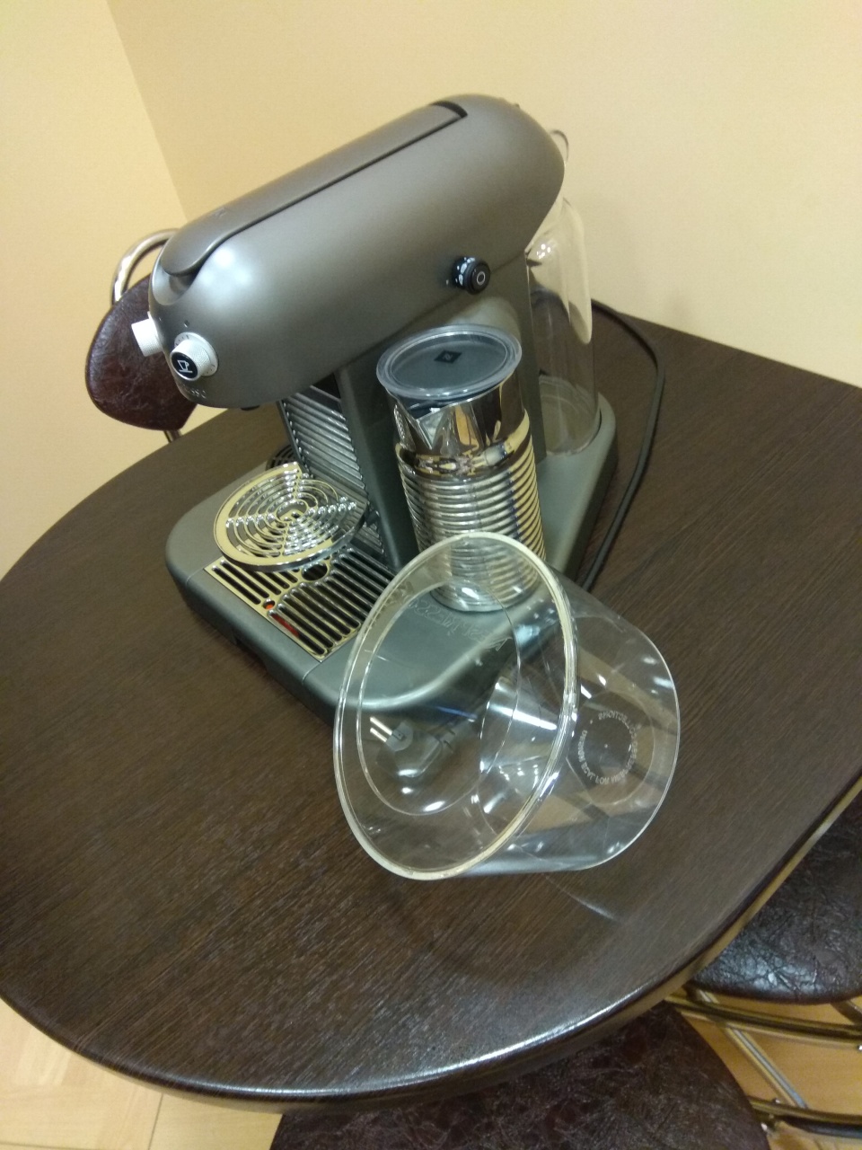 Nespresso Krups - умная, автоматическая, красивая кофемашина из линейки капсульных машин Неспрессо. Это новая, навороченная модель, которая называется Gran Maestria - Большой Мастер. Дизайн у этой кофемашины какой-то космический, "крутой", в первую очередь за счет подсветки в состоянии, когда кофемашина включена. На широкой платформе стоит сама кофемашина, справа от нее капучинатор для взбивания молока.
