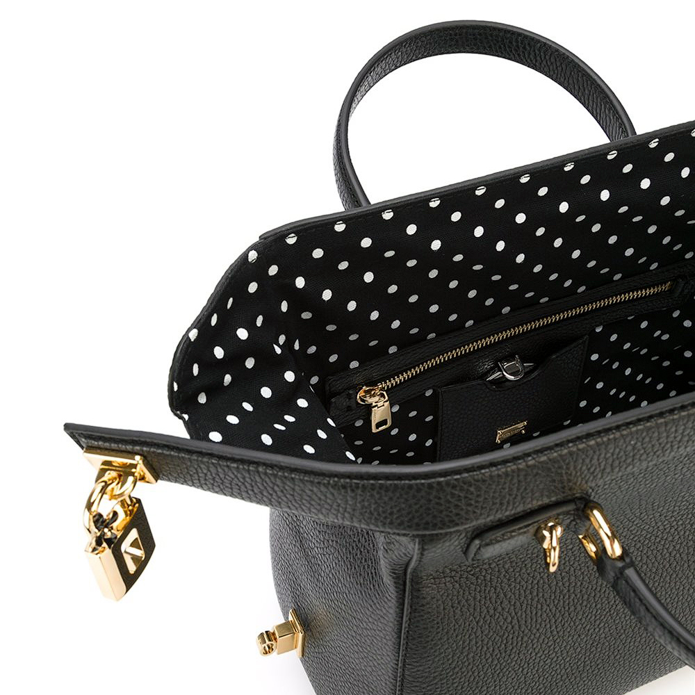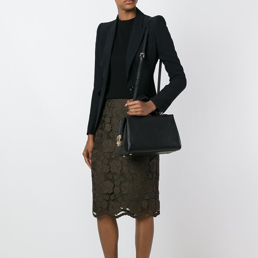 "Черная кожаная сумка с висячим замком от Доменико Дольче и Стефано Габбана вошла в коллекцию 2016-2017 года. Стильная и функциональная сумка с двумя ручками и съемным плечевым ремнем сшита из великолепной зернистой кожи, с подкладкой из ткани в горох."