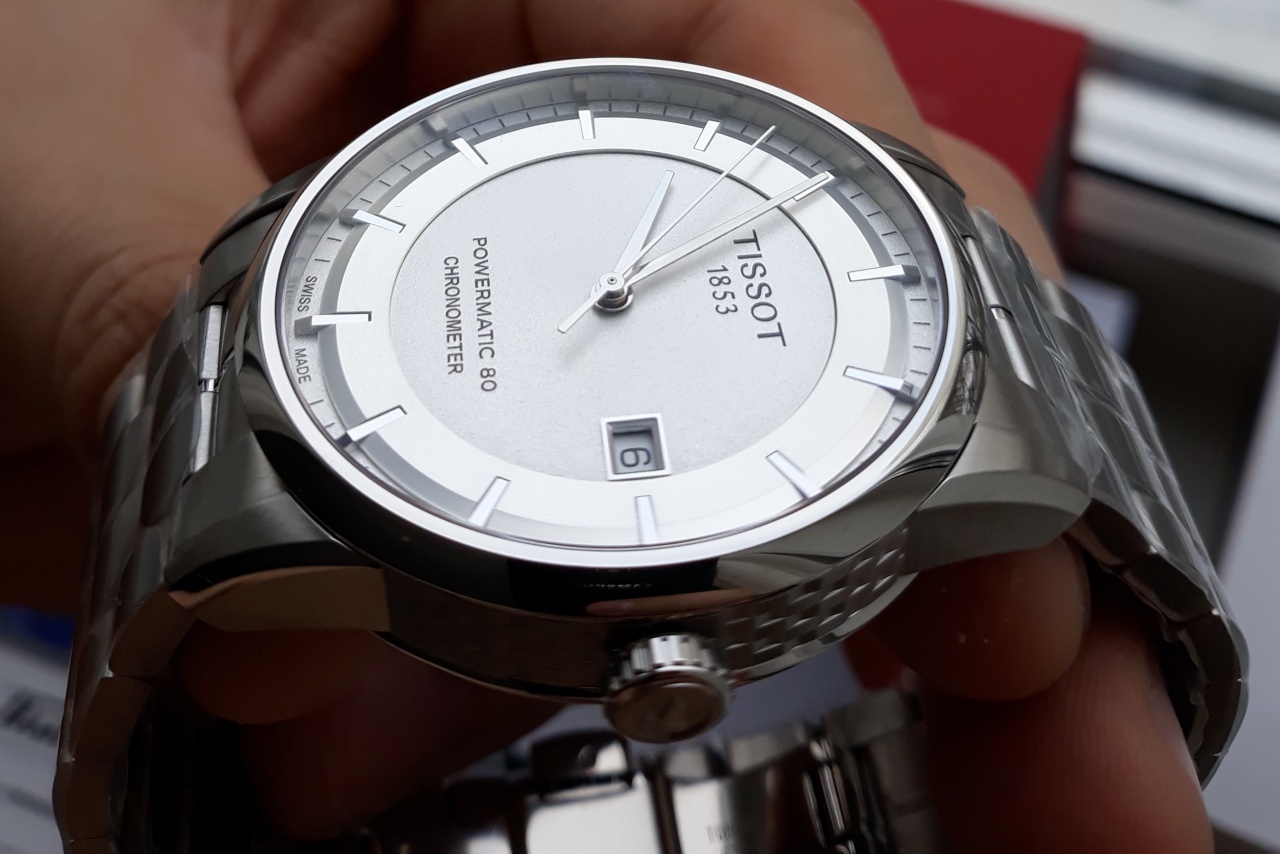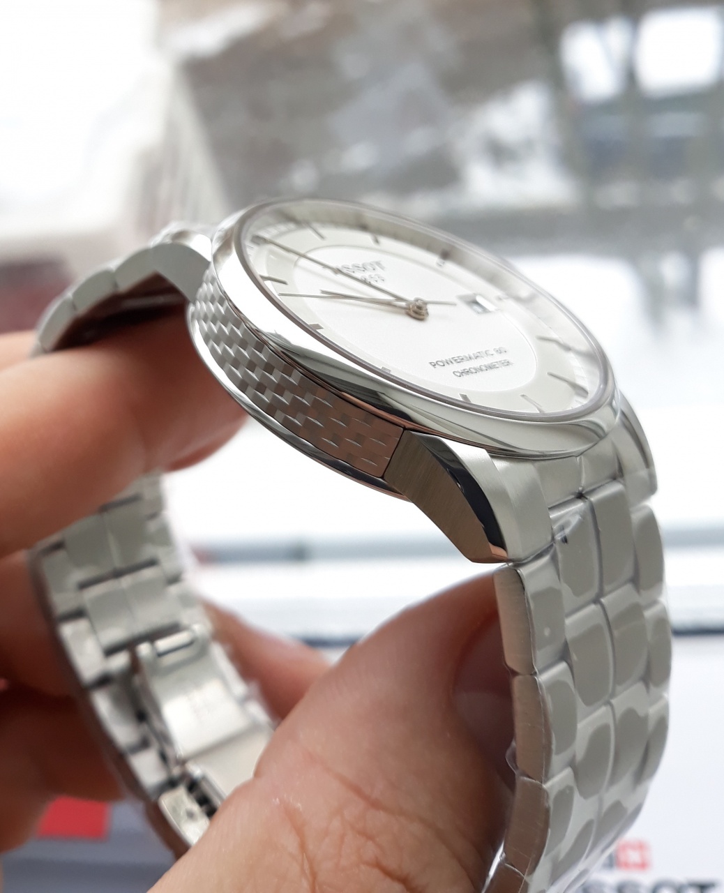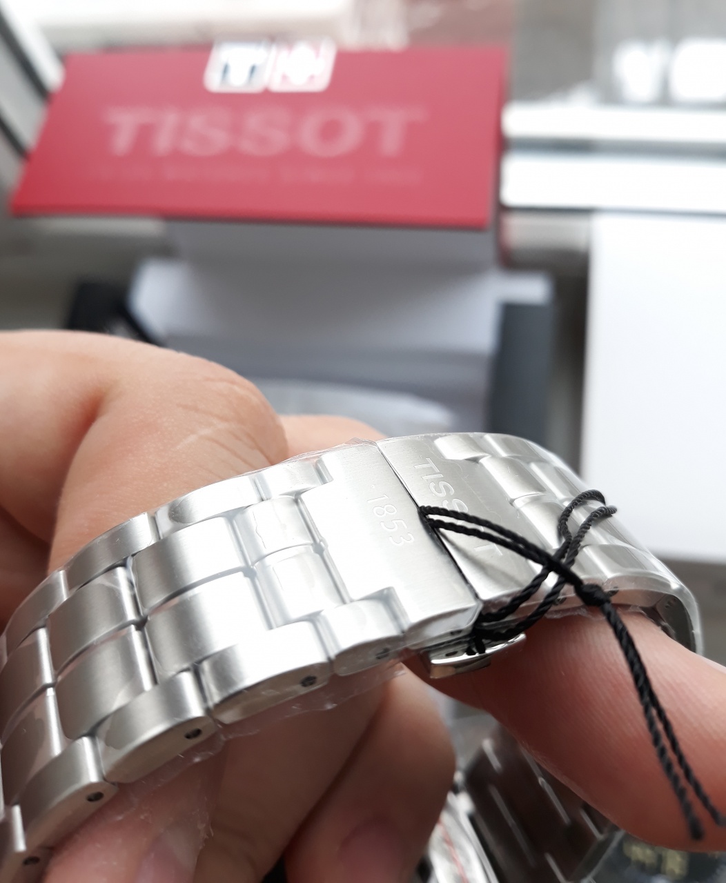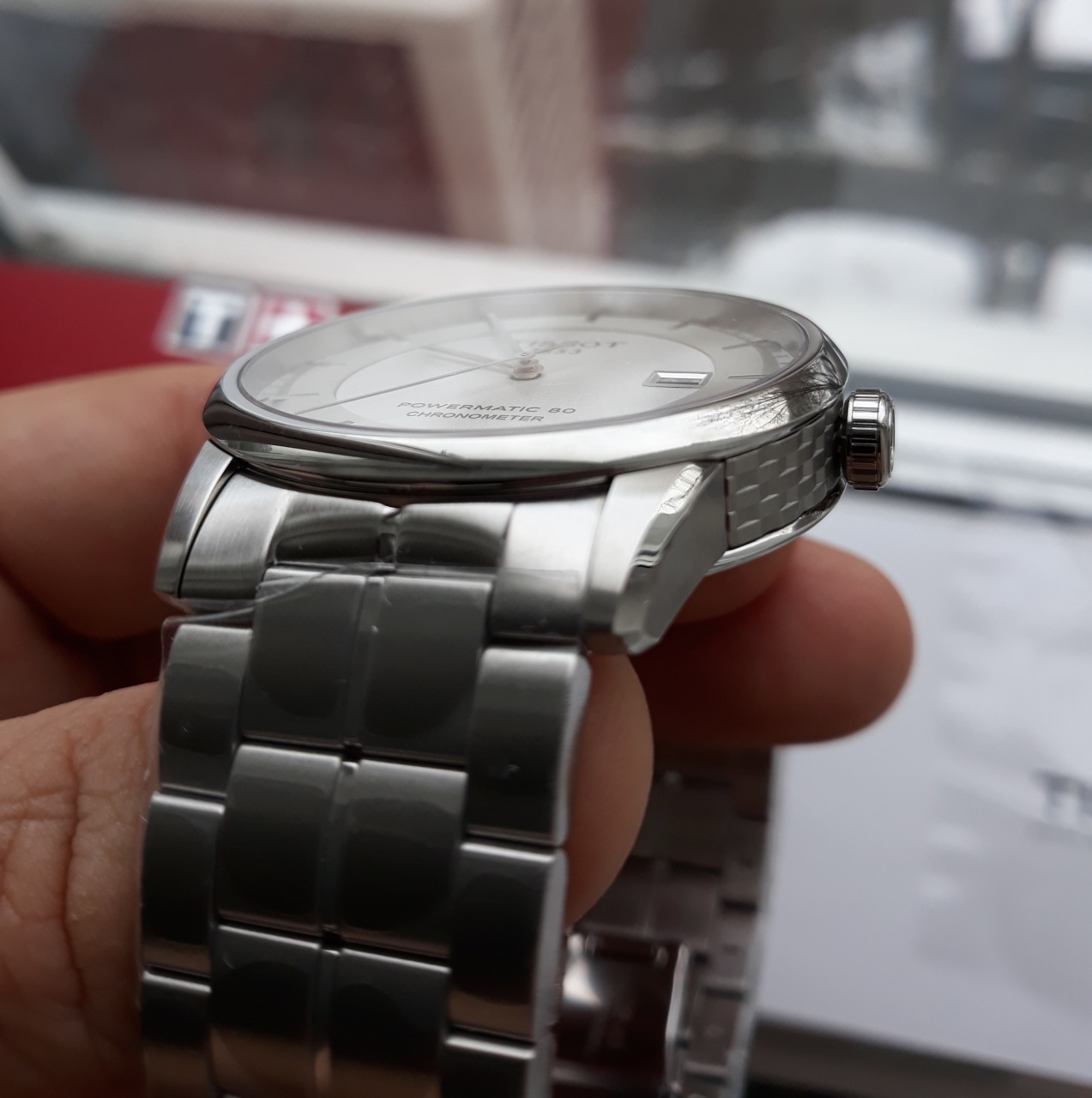 Отделка корпуса и браслета великолепна, привлекают внимание также фирменные атрибуты TISSOT на заводной головке и браслете. Cеребрянный циферблат с метками выглядит строго и по-костюмному.