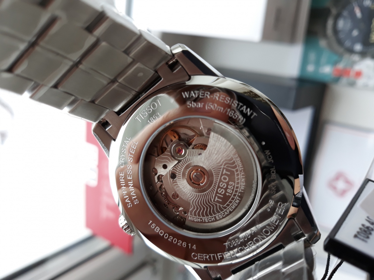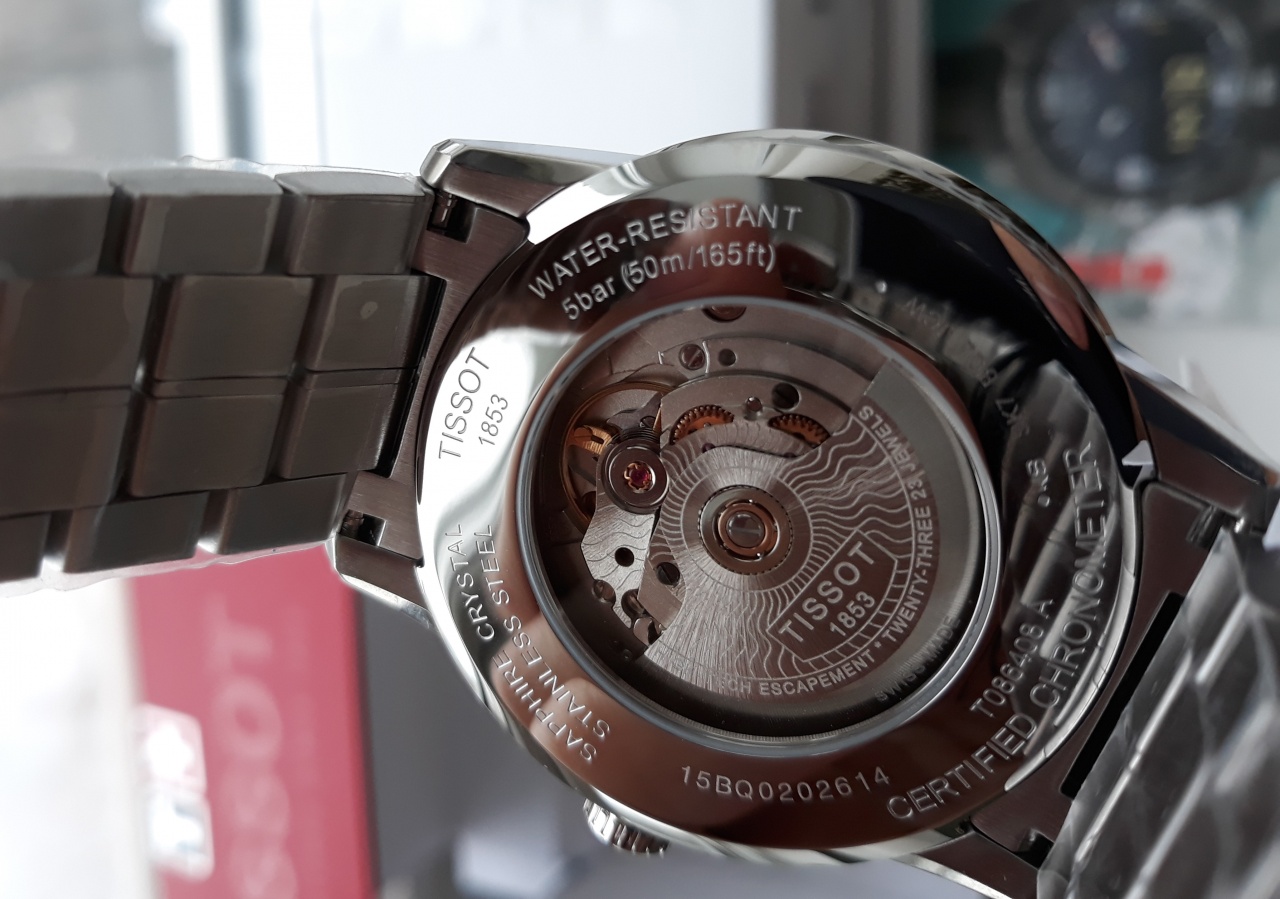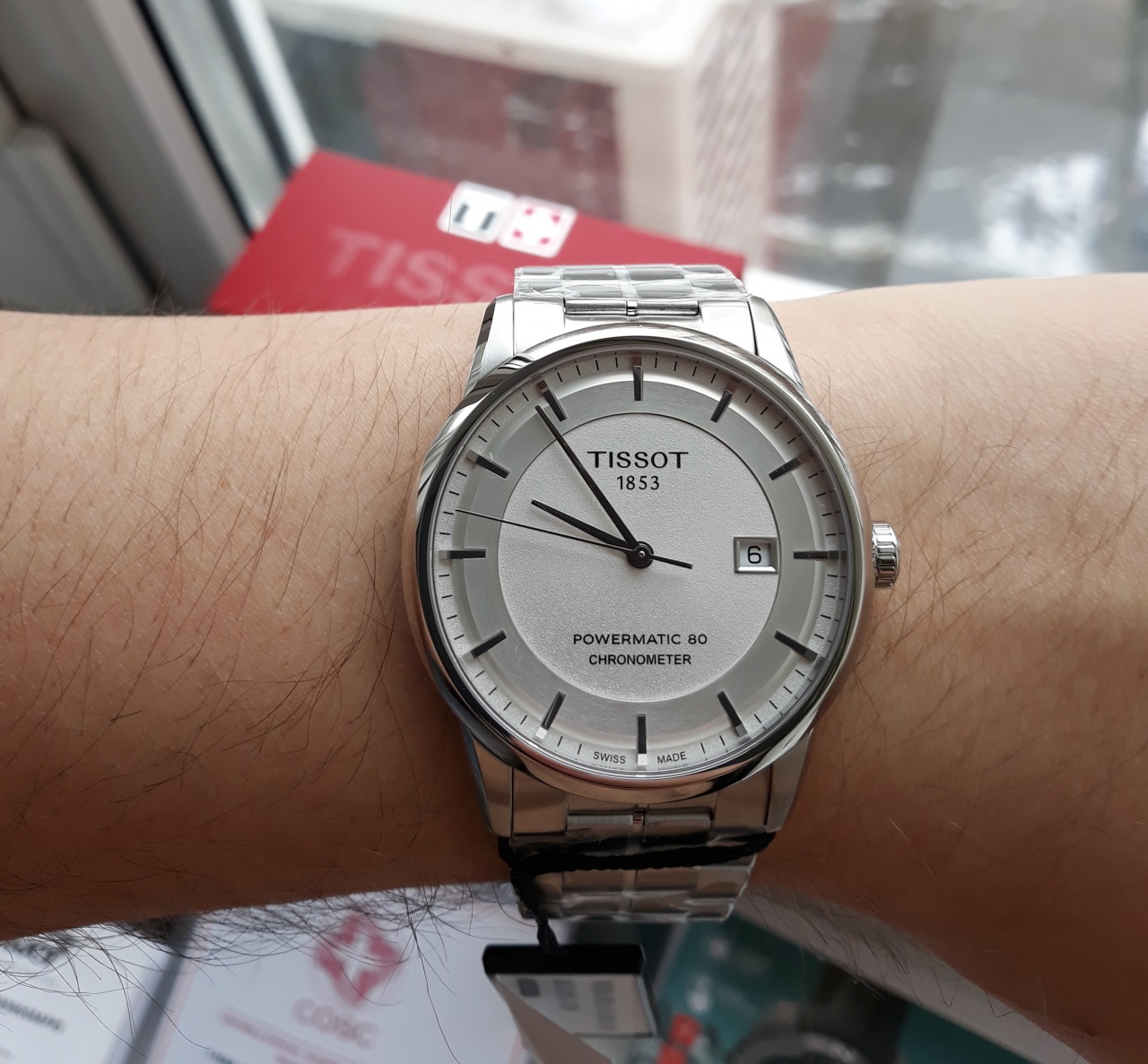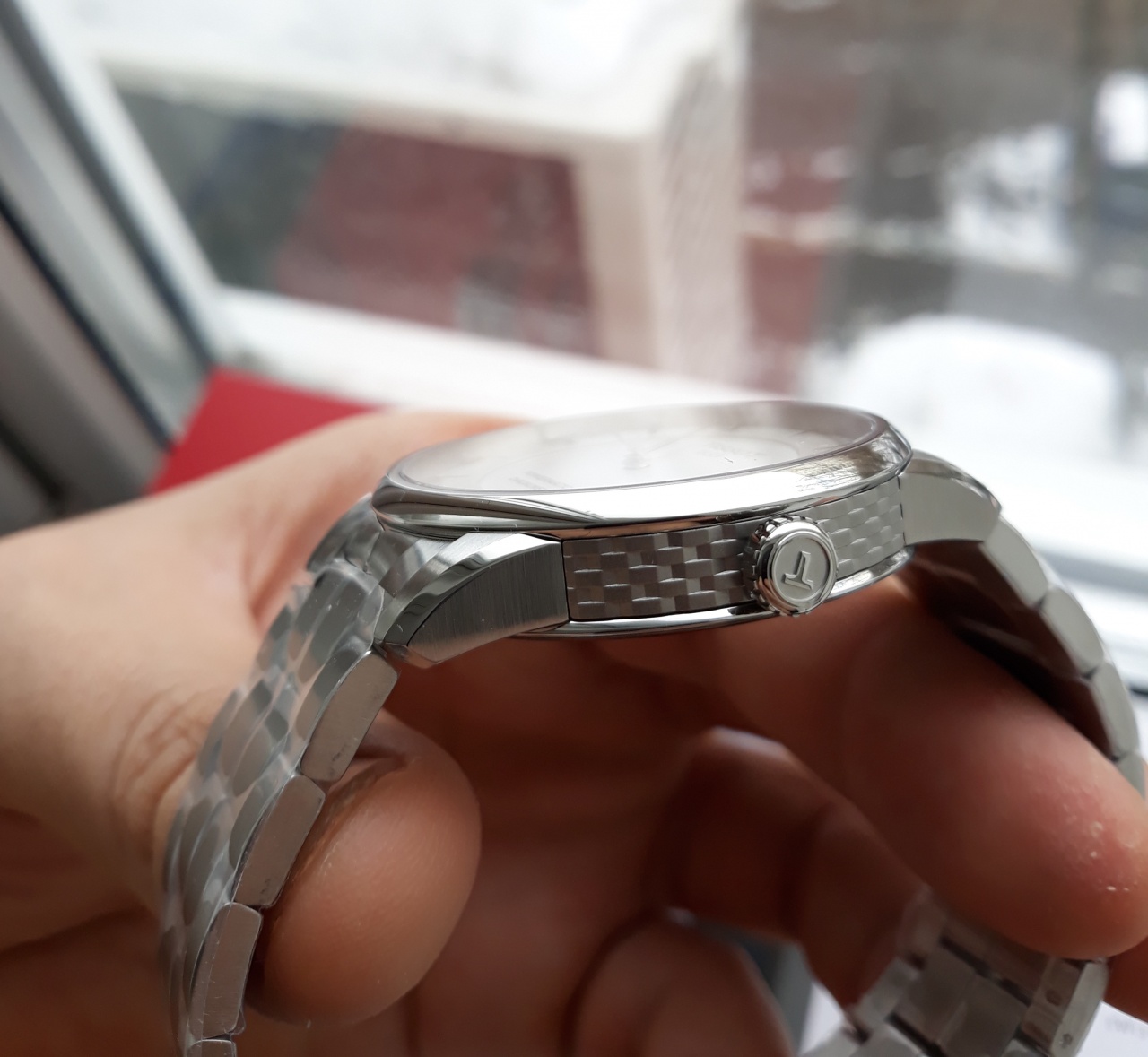 Отделка корпуса и браслета великолепна, привлекают внимание также фирменные атрибуты TISSOT на заводной головке и браслете. Cеребрянный циферблат с метками выглядит строго и по-костюмному.