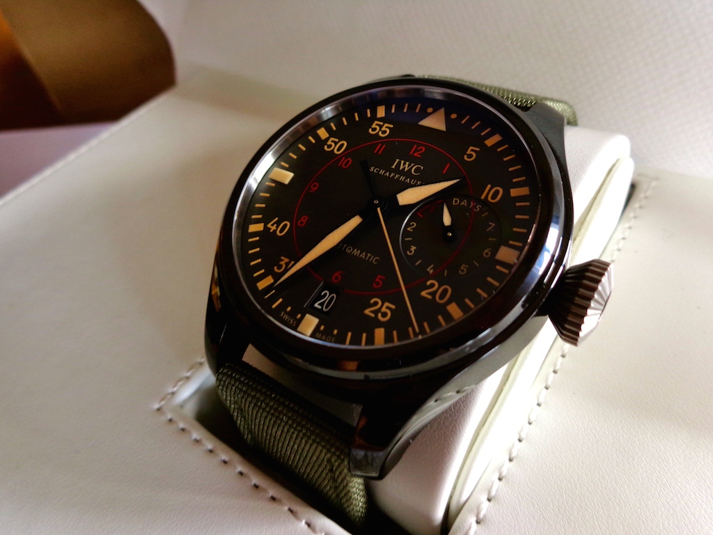 Big Pilot's Watch Top Gun Miramar, оформлены в милитаристском стиле, отличается металлическим оттенком керамического корпуса и классическими военными цветами. Нетрадиционные деления на внешней шкале и внутренняя часовая шкала напоминают приборные панели самолётов 1930-х и 40-х годов, являясь, таким образом, историческим наследием серии IWC Pilot's Watches.