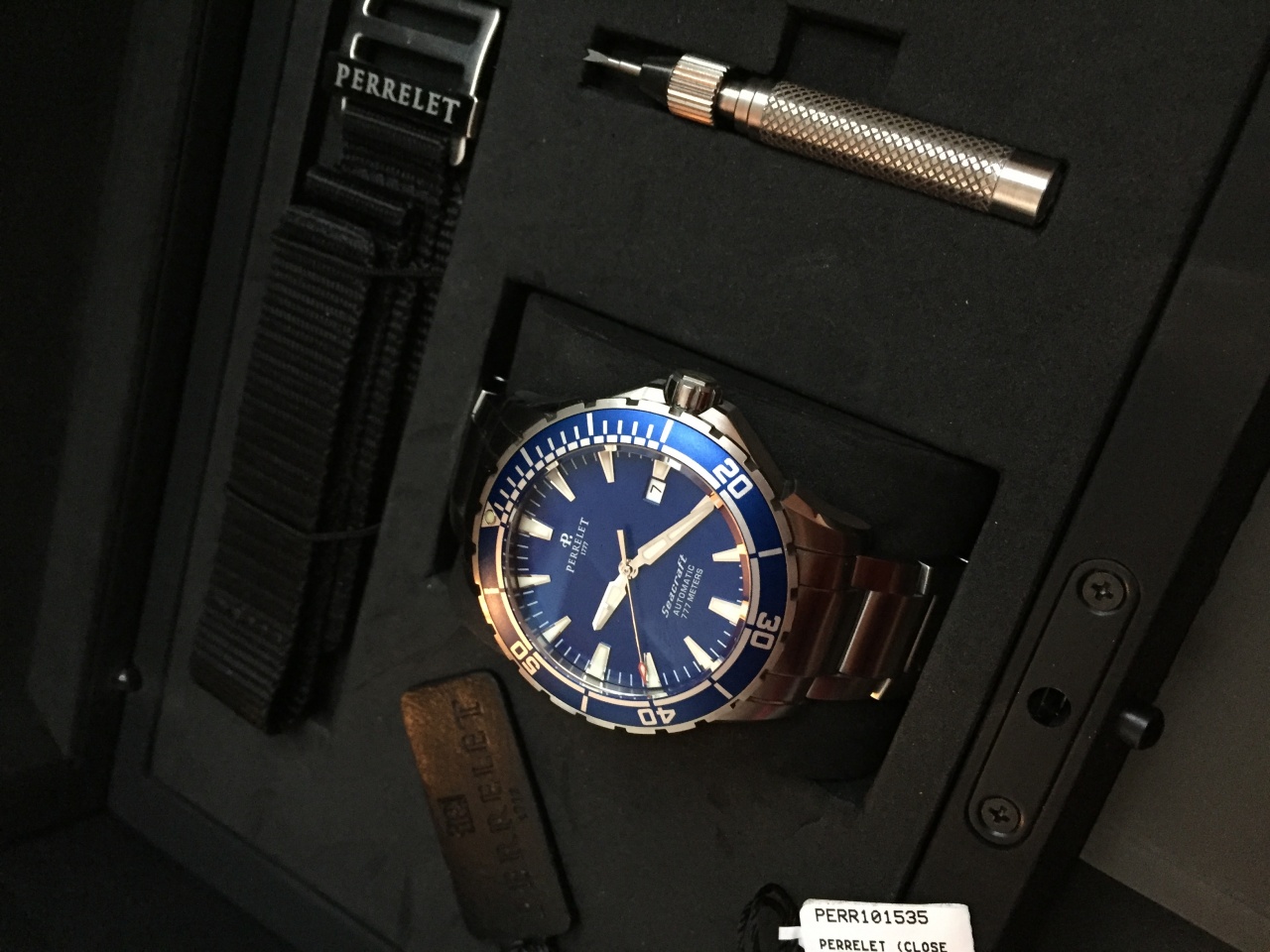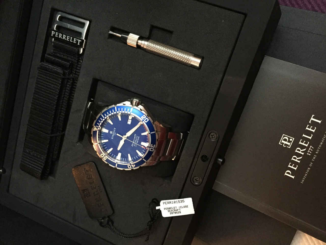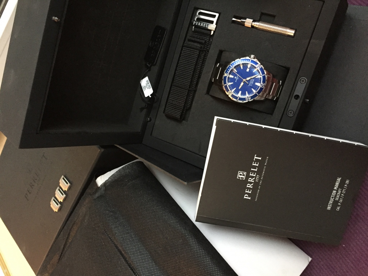 В комплекте новый фирменный нейлоновый ремень и съемник браслета с маркировками Perrelet.