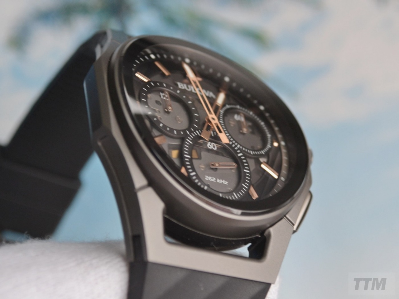 Часы-хронограф с секундомером. Изогнутый механизм с частотой колебаний