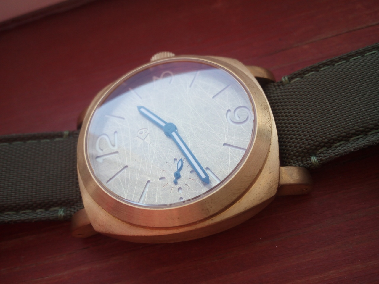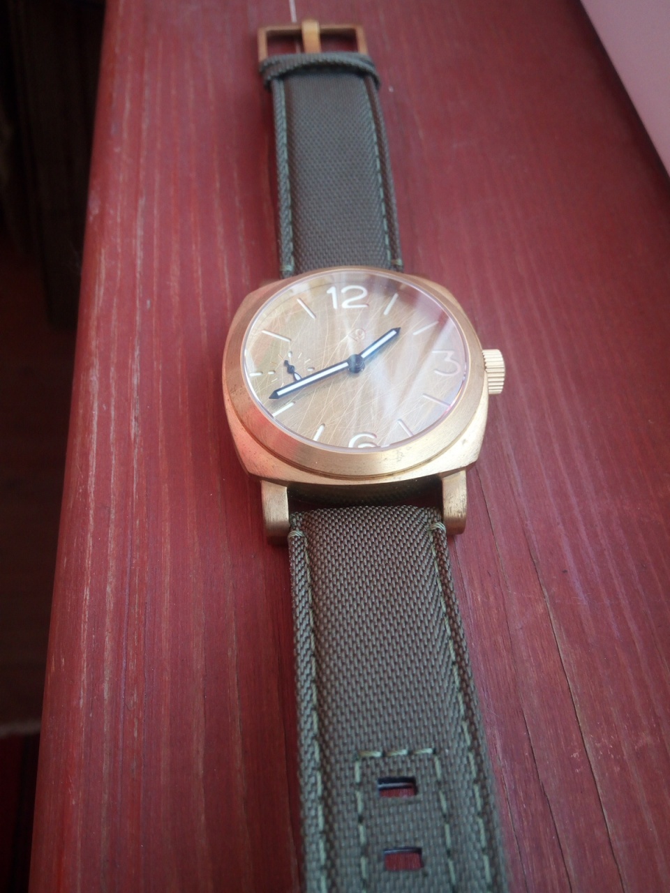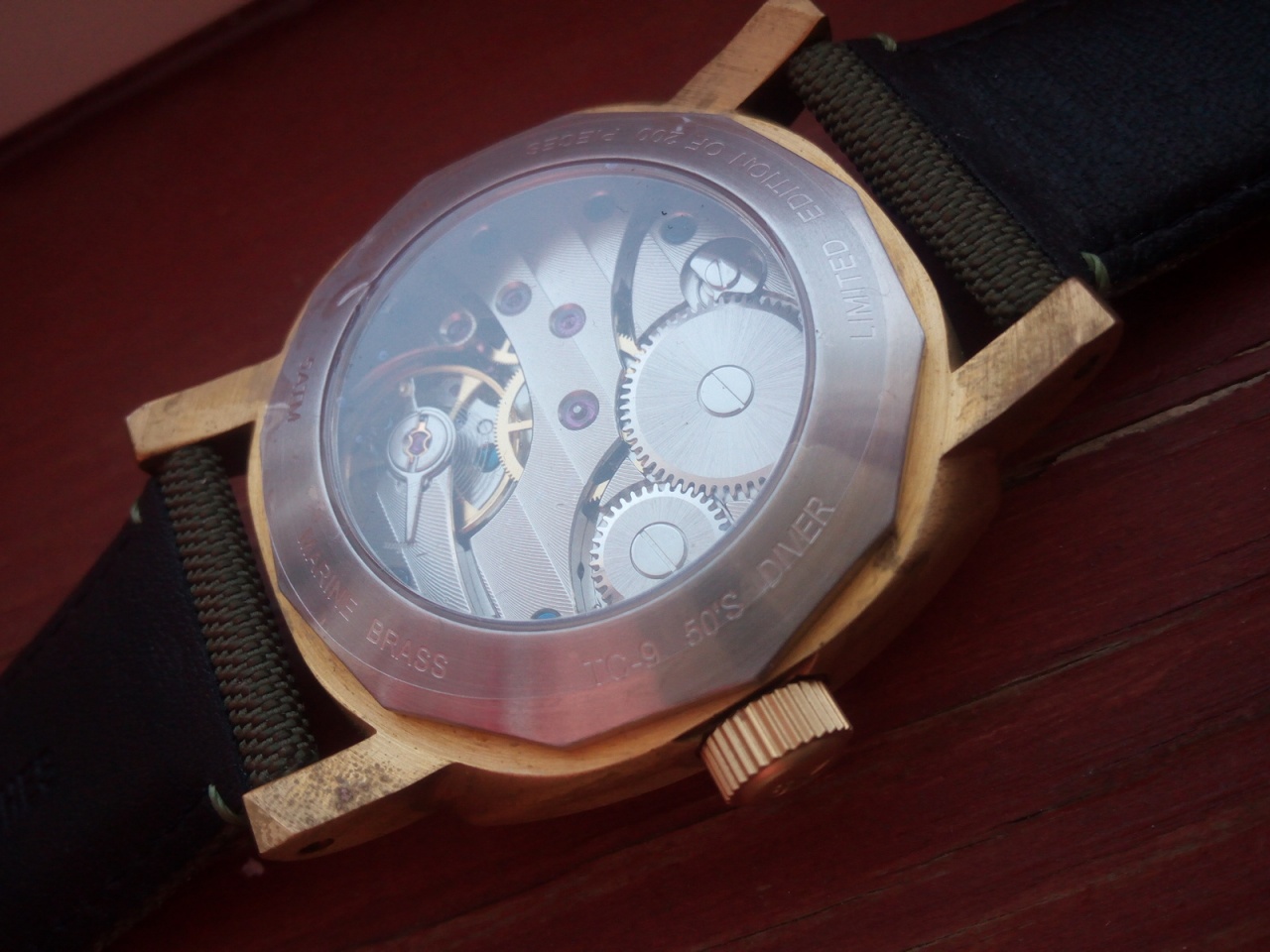 Толстый циферблат из латуни толщиной 0,8 мм. типа "сендвич", со временем тоже будет патинироваться, как и корпус.
