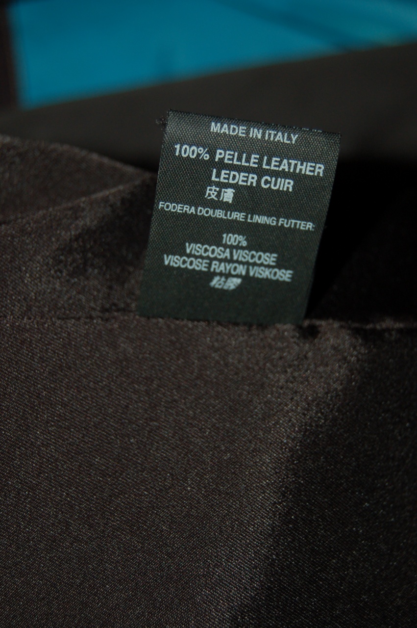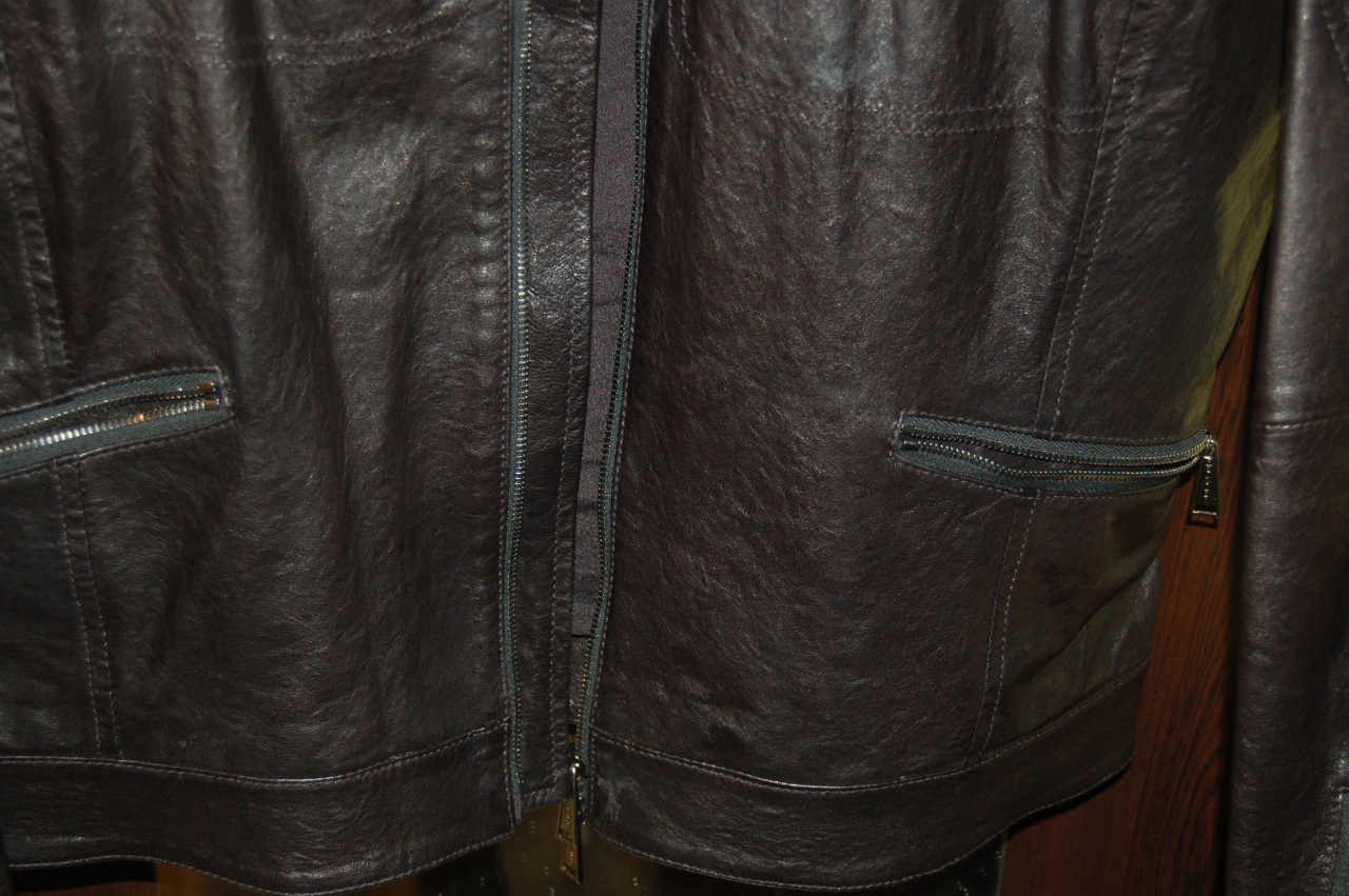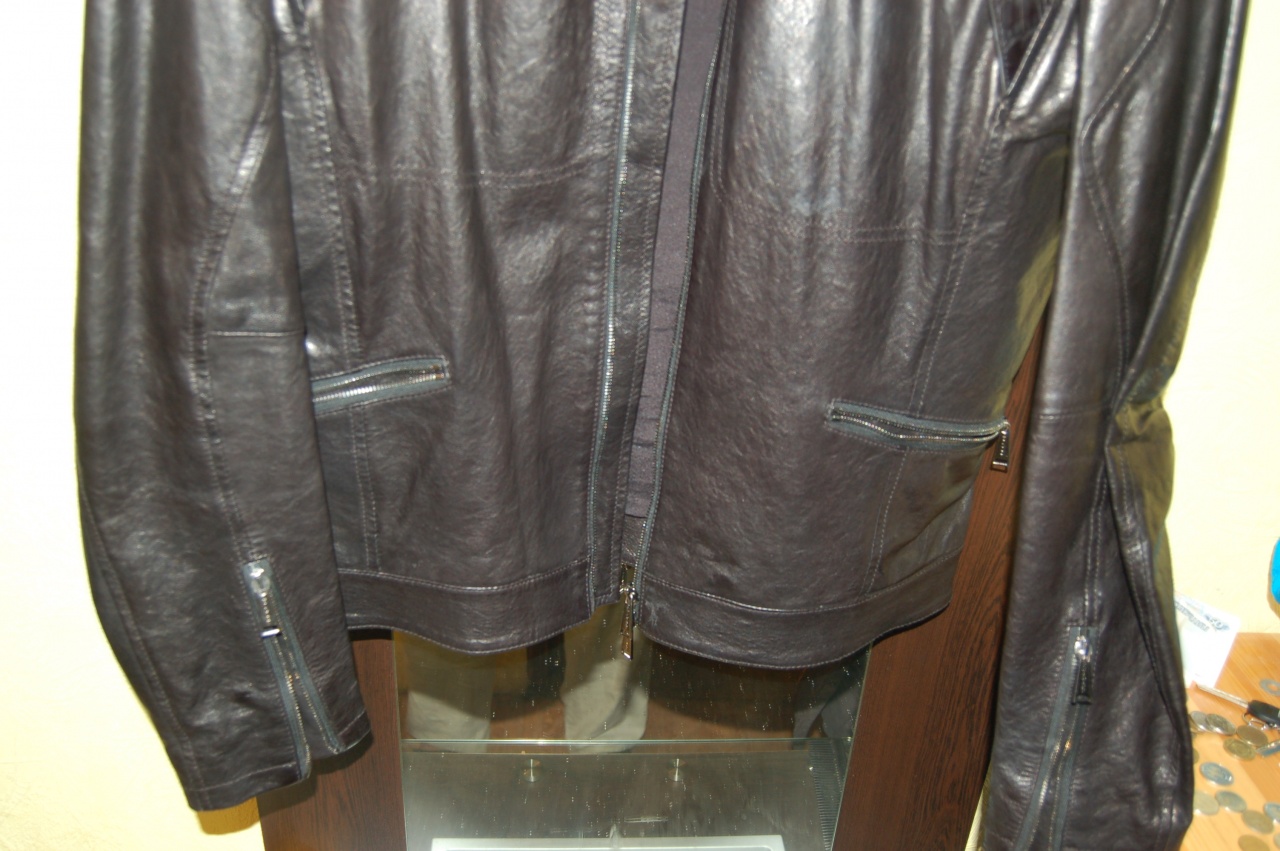 Описание: черная куртка -бомбер (длина по спинке – 72 см) изготовлена из мягкой кожи ягненка со вставками из кожи крокодила. Поставщик кожи – PELLE LEADER, голографический ярлык имеется. Стоимость такой новой комбинации где-то 16000 – 18000 Евро. Модель прямого кроя с рукавами реглан, со вставками из крокодила на плечах, передней части и эмблеме, 4 внешними карманами на молнии и одним внутренним карманом на молнии (с флагом Италии). Рукава – внизу молния, длина 71 см.