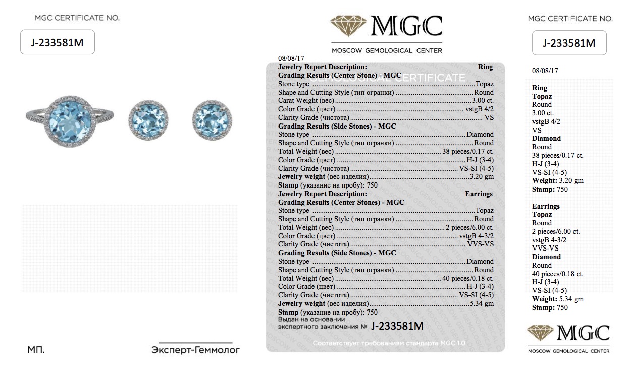 Кольцо и серьги из белого золота с топазами 9 карат и бриллиантами 0,35 карат (сертификат МГЦ)