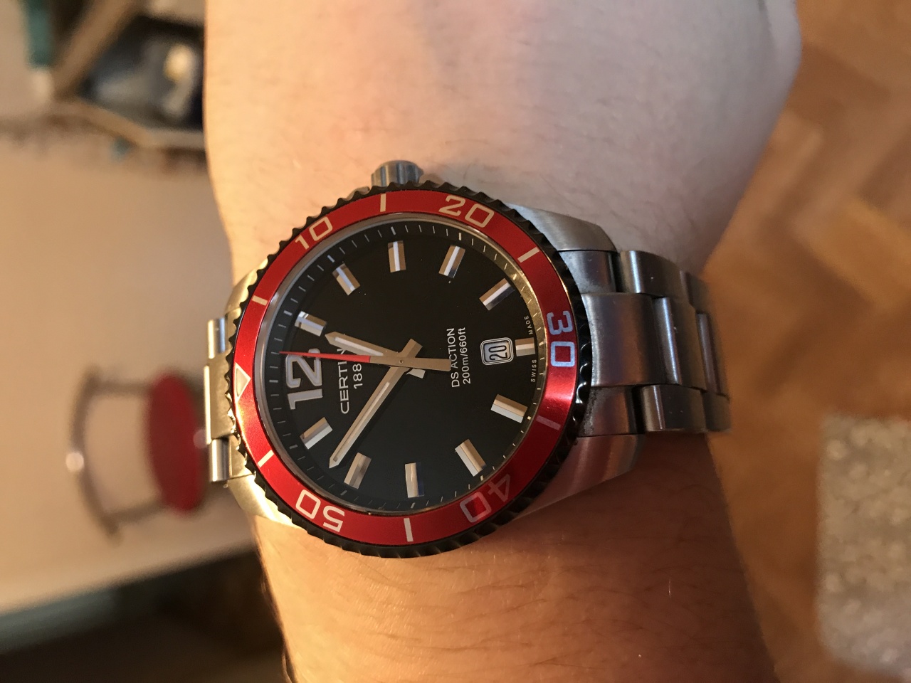 CERTINA DS ACTION. Красивый спортивный отлично читаемый (с дайверским уклоном ) дизайн. Точнейший механизм. За два года подводил может раза три на 2-3 секунды. На браслете имеются потертости. Сами Часы в идеальном состоянии. Часы с момента покупки на вскрывались. Батарея не менялась.заводские прокладки сохранены. Оригинальный сертиновский противоударный механизм. Водозащита 200м