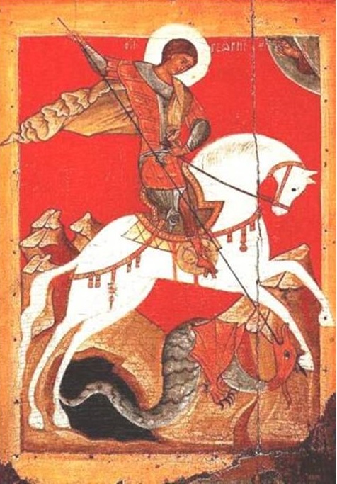 Георгий - святой покровитель Москвы, изображен на Московском гербе и Российском Государственном флаге. Всадник с копьем - символ защиты Родины, был изображен на российских монетах еще в 13-ом столетии. Большая Государственная Печать великого князя Ивана III (1947 год) также несла на себе рисунок всадника, убивающего змея. Начиная со времен царя Ивана IV Грозного, всадник был расположен на груди двуглавого орла - государственного герба. В некоторых случаях его изображали облаченным в мантию и корону.