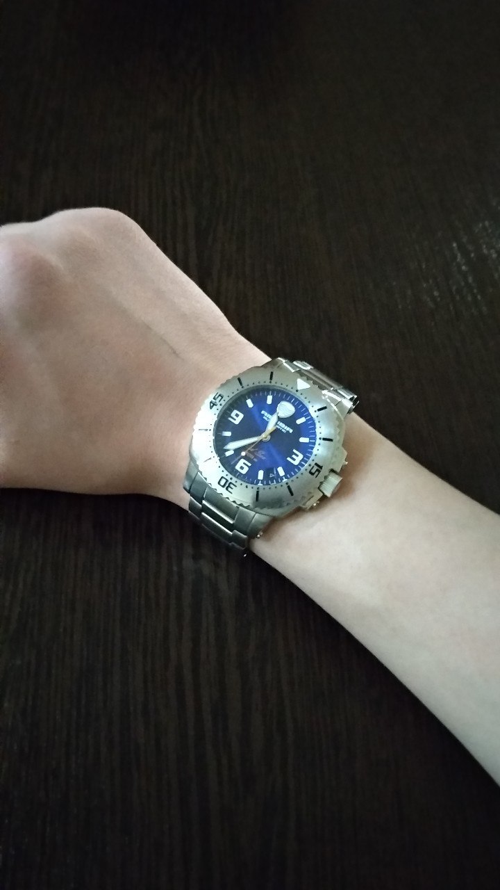 2) Привычное положение часов подальше от кисти лично для меня оказалось неприемлемым для столь большого корпуса. Часы сидели комфортно лишь в положении ближе к косточке, но возникла проблема того, что стала мешать ЗГ. Перекинул часы на правую руку, и после 2 недель носки на правой, оказалось, что это вполне удобно - ЗГ абсолютно не мешает, более удобная посадка(правая рука оказалась чуть больше левой). Первую неделю бил часы обо всё подряд, но затем приноровился, выработался тот же рефлекс, что и на левой, т.е. интуитивно начинаешь отодвигать руку от места потенциальной опасности для часов.