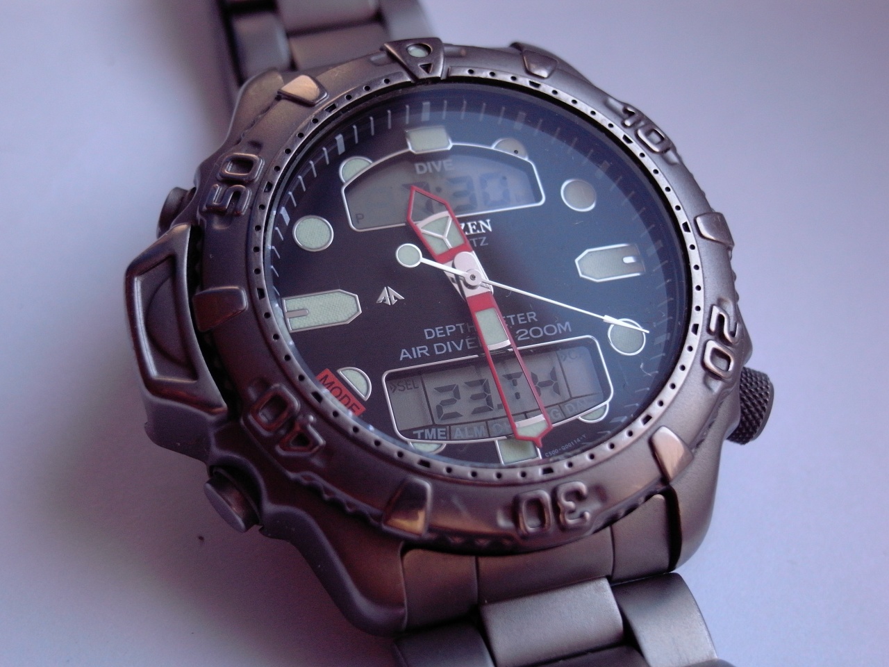 AIR-DIVER 200M CITIZEN часы легкие много функций я не дайвер и не летчик найдется эта модель дешевле рад буду узнать))) батарейка новая довольно большая -панасоник поставил))к радости не ши-шоки часы не белые или розовые из пластика а из скромного титана на циферблате нет изображения хело китти Мужские часы))