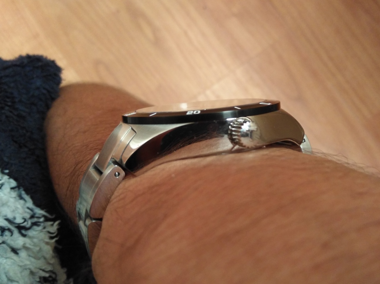 Отменный литой браслет с застежкой "бабочка", один из лучших по качеству из всех, ранее мной виденных браслетов вообще, т.к. браслет литой полностью, включая и крайние звенья и застежку, сам браслет - массивный но НЕ гремящий, волоски на запястье - НЕ щиплет совершенно, а удачный угол его фиксации по отношению к корпусу часов - обеспечивает потрясающую эргономику и комфорт от часов на руке несмотря на их немалый вес под 170 грамм