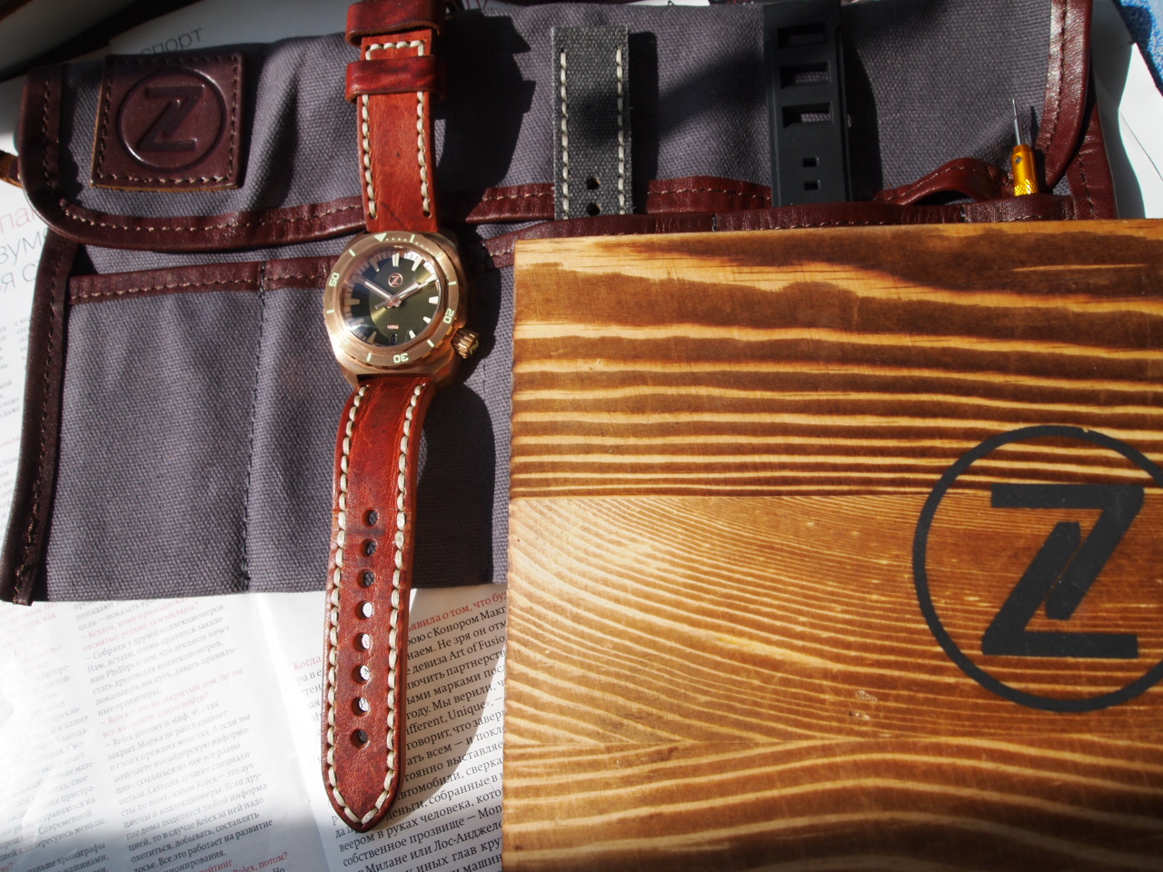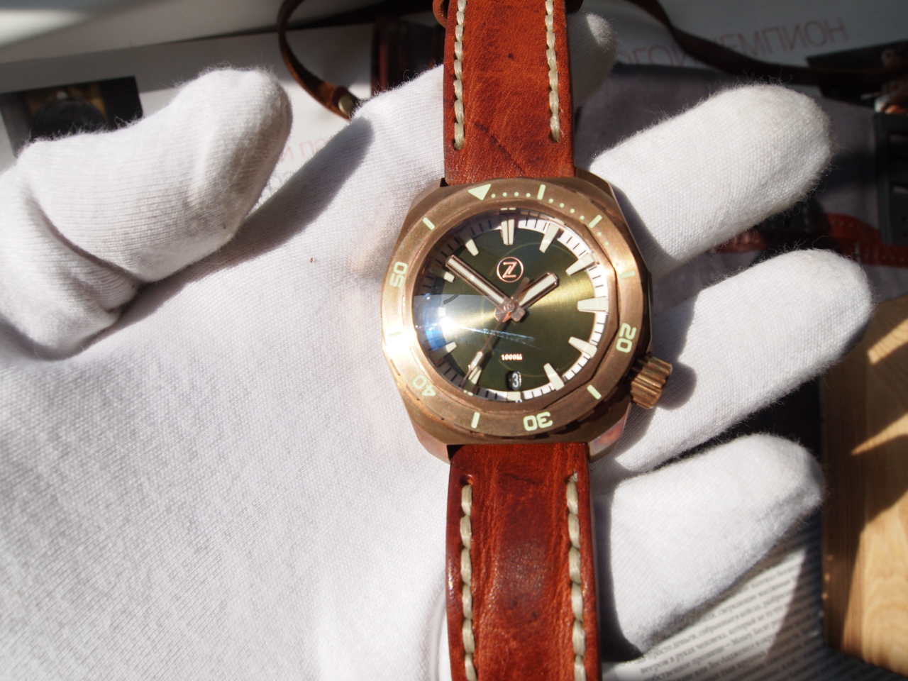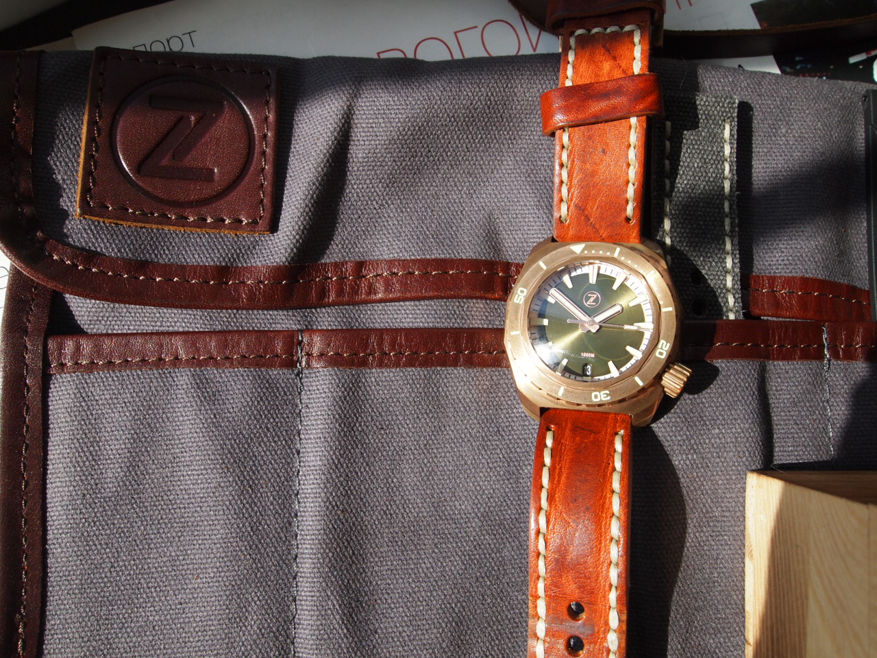 Корпус часов от Zelos - чистейшая бронза, слегка подернутая благородной патиной, внутри него, японский механизм с автоподзаводом Seiko NH35A, сверху - сапфировое, выпуклое стекло с антибликом, снизу - стальная крышка, с гравировкой.