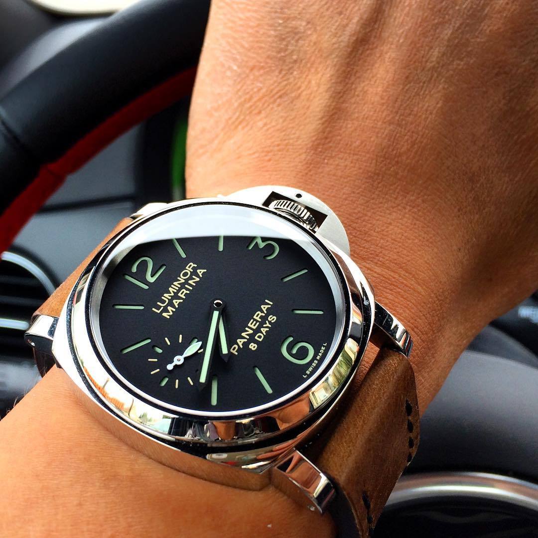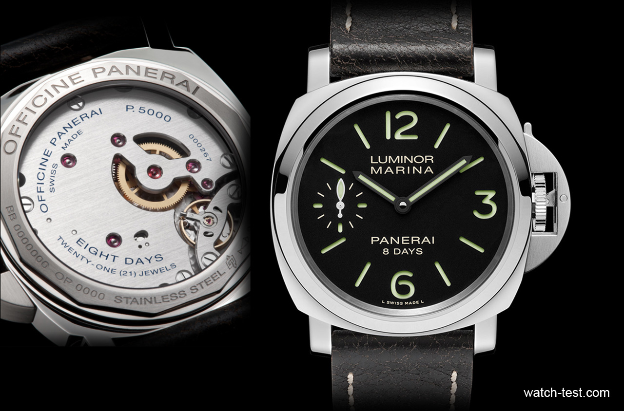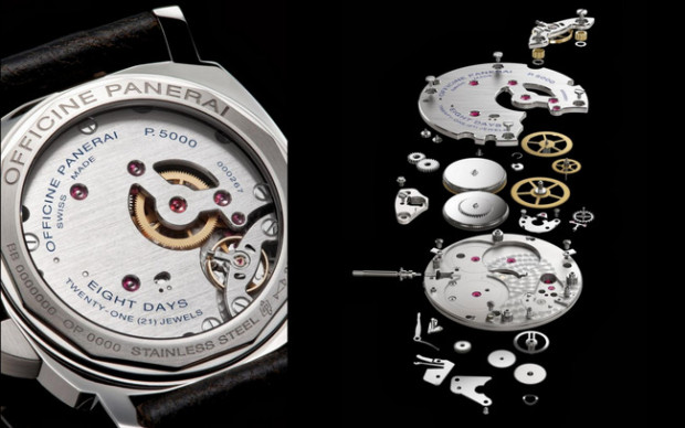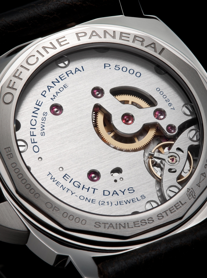 -У модели удобный 44-миллиметровый корпус. Функционал классический - часы, минуты, маленькая секундная стрелка. Внутри стоит мануфактурный калибр P.5000, который выполнен в стиле механизмов старой 'панераевской' школы. Благодаря прозрачной задней крышке можно полюбоваться на его минималистскую отделку. Завод у калибра ручной и отличается этот 'движок' впечатляющей выносливостью - два заводных барабана обеспечивают часам бесперебойную работу в течение 8 суток. -