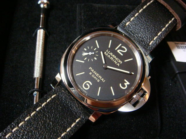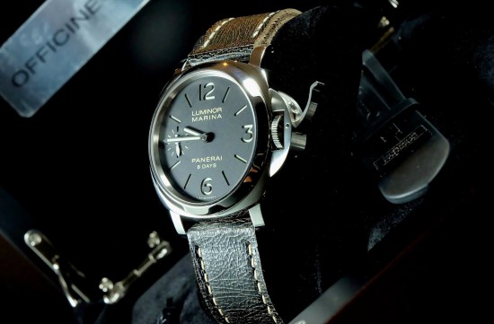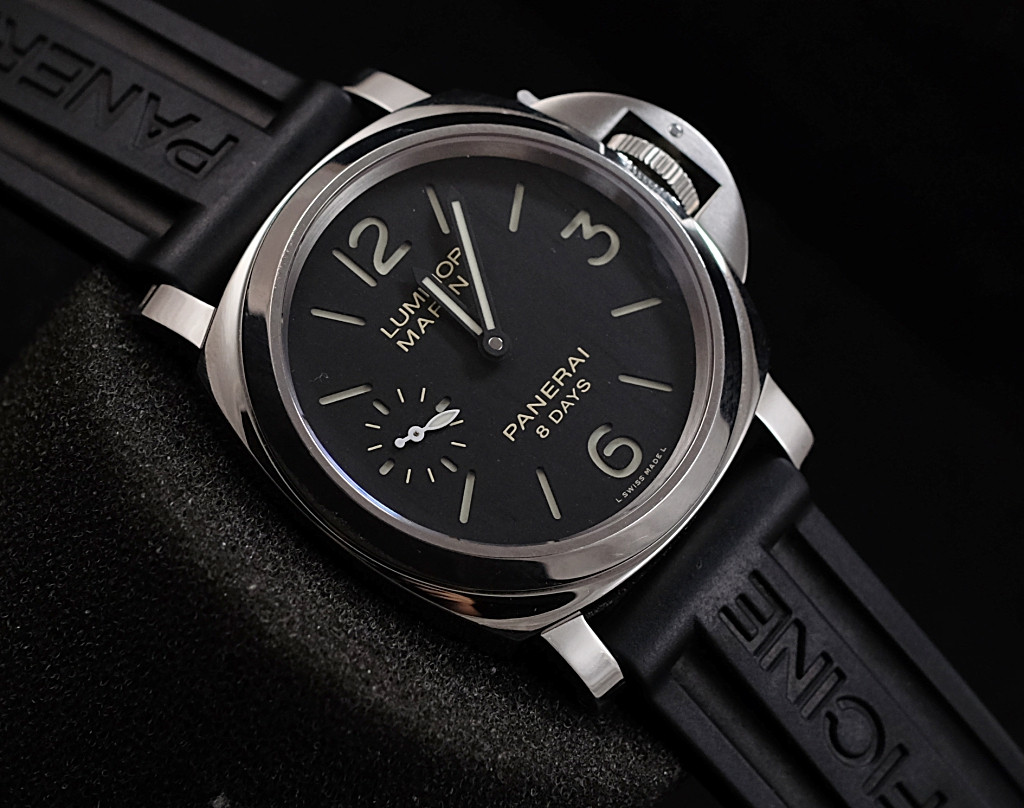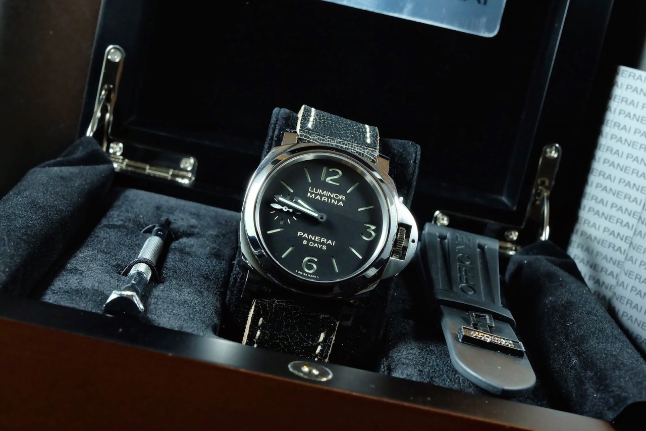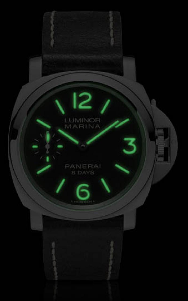 -У модели удобный 44-миллиметровый корпус. Функционал классический - часы, минуты, маленькая секундная стрелка. Внутри стоит мануфактурный калибр P.5000, который выполнен в стиле механизмов старой 'панераевской' школы. Благодаря прозрачной задней крышке можно полюбоваться на его минималистскую отделку. Завод у калибра ручной и отличается этот 'движок' впечатляющей выносливостью - два заводных барабана обеспечивают часам бесперебойную работу в течение 8 суток. -