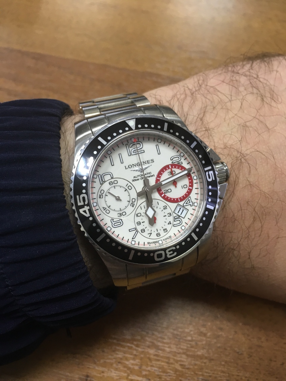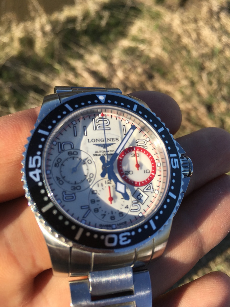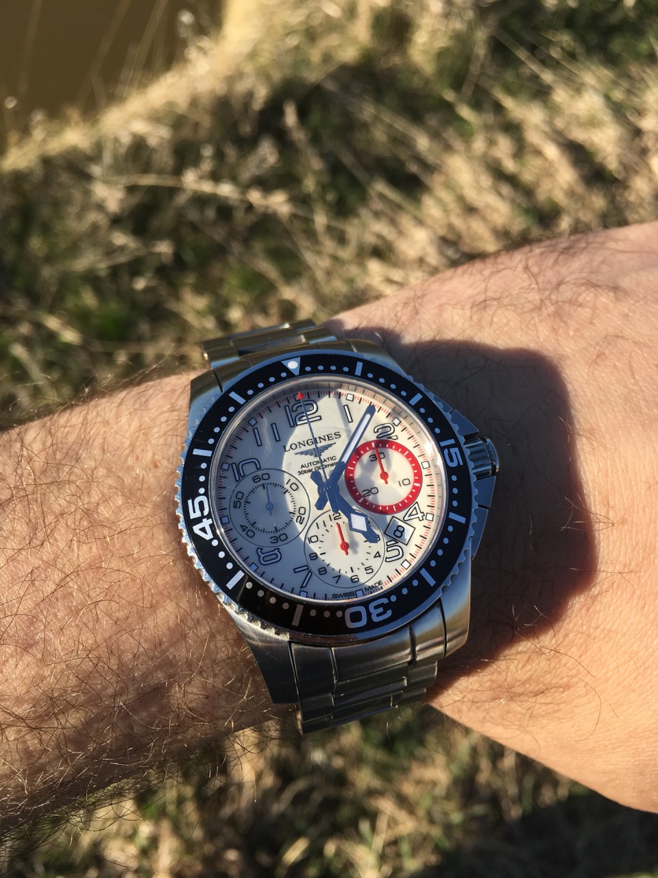 Часы-хронограф Longines Hydroconquest модельного ряда Sport с колонным колесом, в круглом стальном корпусе на звеньевом металлическом браслете (+доп звено) 41 мм диаметр, 300 м водозащита, дайвер. Складная застежка с двойной блокировкой, встроенная система увеличения длины. Молочный циферблат, однонаправленно вращающийся безель из анодированного алюминия с черным покрытием, завинчивающиеся задняя крышка и заводная головка. Три дополнительных циферблата: 60 секунд, 30 минут, 12 часов. Стрелки и метки с подсветкой. Выпуск: Базель 2013. Калибр: L688 на основе ETA совместно с Frédéric Piguet разработала новый механизм хронографа с колонным колесом. Механика автоподзавод. Запас хода: 54 часа. Естественные следы носки.