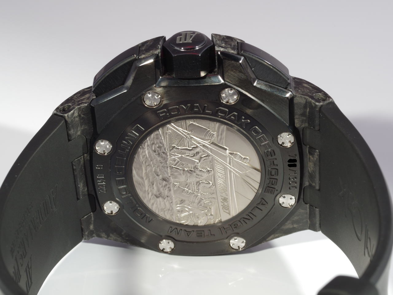 Корпус часов и рант изготовлен из черного закаленного карбона – чрезвычайно легкий и очень прочный материал. Заводная головка и кнопки хронографа – черная керамика. Стрелки покрыты люминесцентным покрытием. Функция хронографа «Flyback» и т.н. счетчик – регата, который был разработан в соответствии с настоящими правилами соревнований. Ремень черный каучуковый, застежка титановая с черным PVD – покрытием.