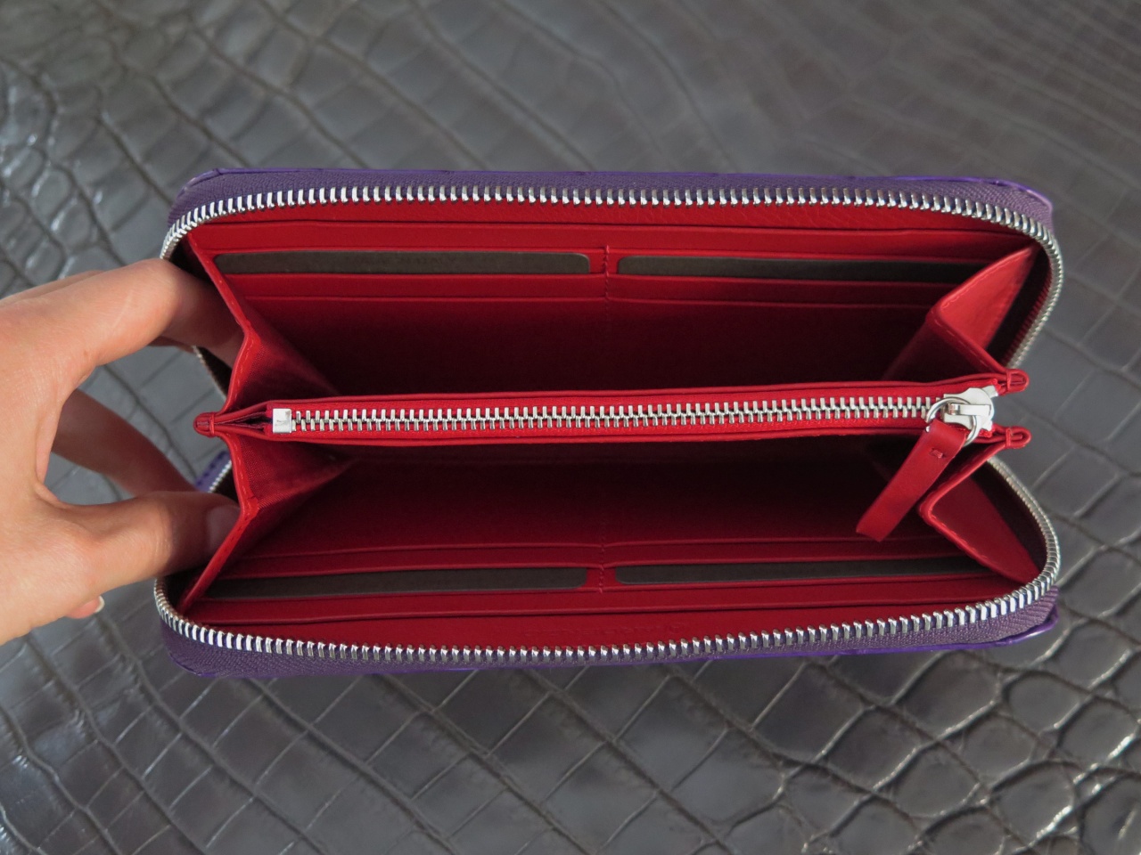 Внутри клатч отделан телячьей кожей красного цвета и имеет два больших отделения под банкноты (евро, доллары, рубли), 12 отделений для кредитных карт или визиток, два отделения для паспорта, водительских прав и других документов, и центральное отделение для монет, застёгивающееся на металлическую молнию.