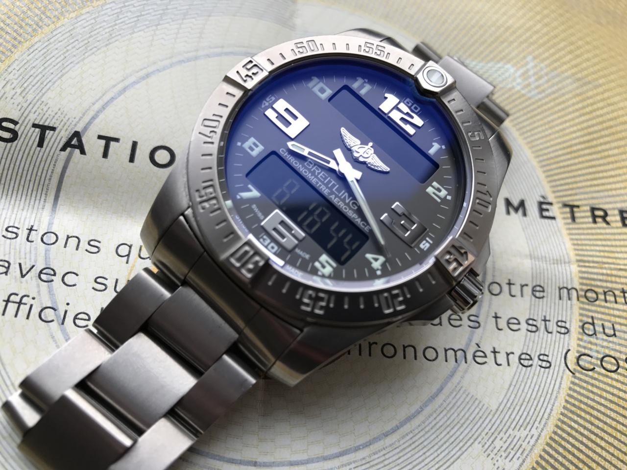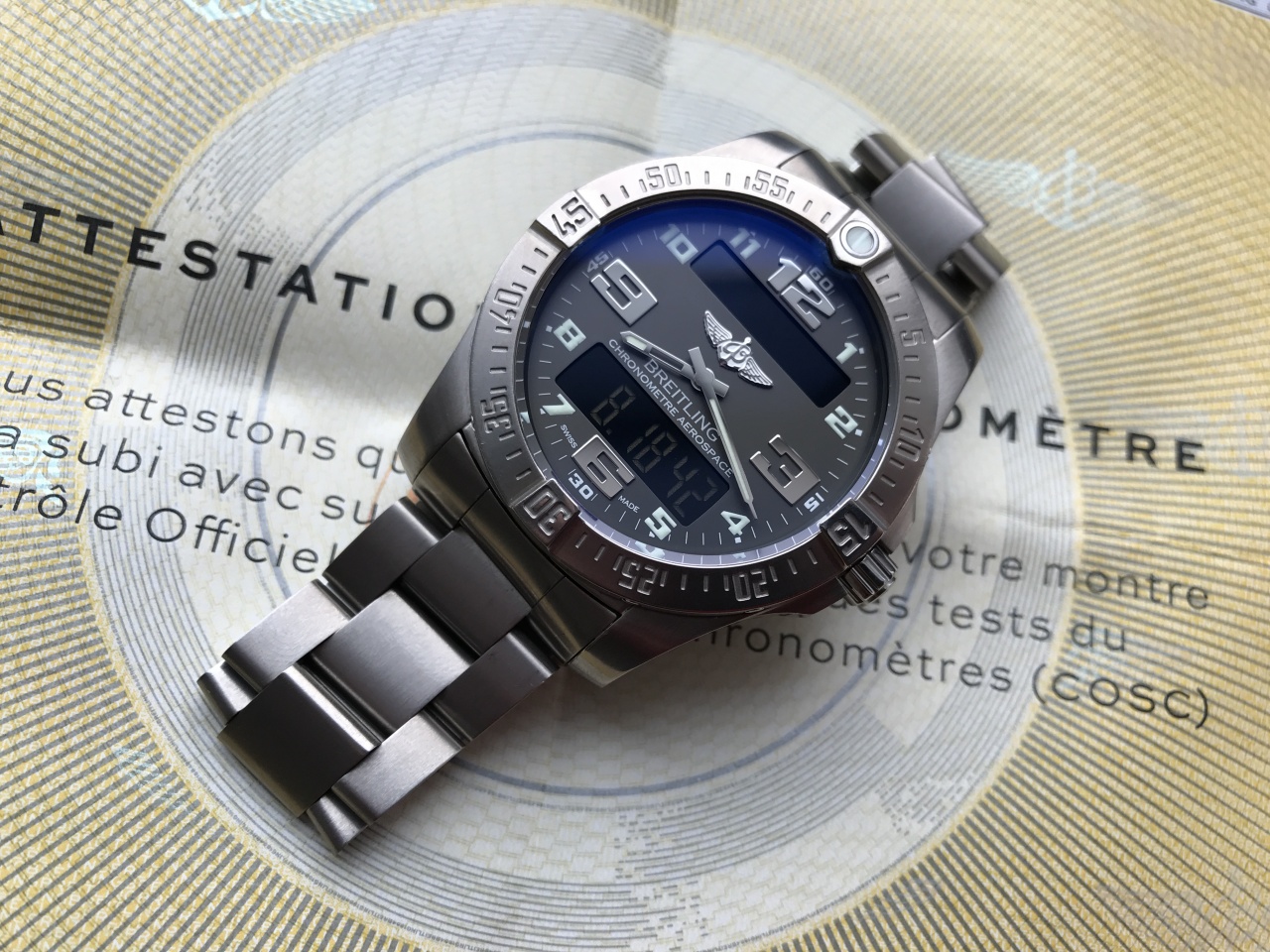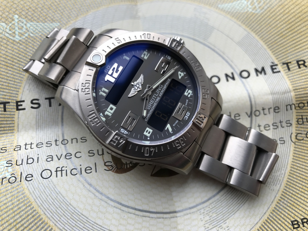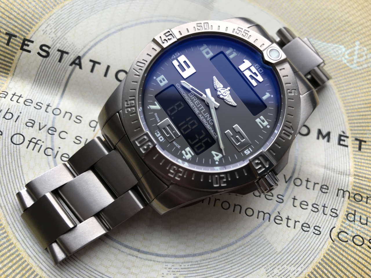 Механизм: Breitling 79, SuperQuartz™, термокомпенсирующийся, кварцевый электронный, аналого-цифровой ЖКД с подсветкой 12/24 ч., индикатор срока замены батареи