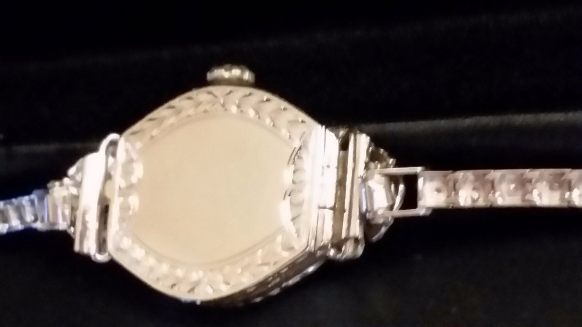 Solid White Gold 14k Case and Band with Diamonds on both Bezel and Band. 69 "Old Mine Cut" Diamonds in total. Exaggerated Deco Arabic Numerals. Spade Hands. Length overall approximately 6 inches.