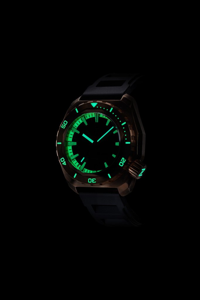 - Бронзовый корпус в размере 44 мм (CuSn8 - 'правильная' морская бронза, приобретающая красивую и глубокую патину) Патина эта, как известно, легко удаляется салфеткой или ватной палочкой, смоченной в лимонном соке. Я лично один раз попробовал - сие есть так!