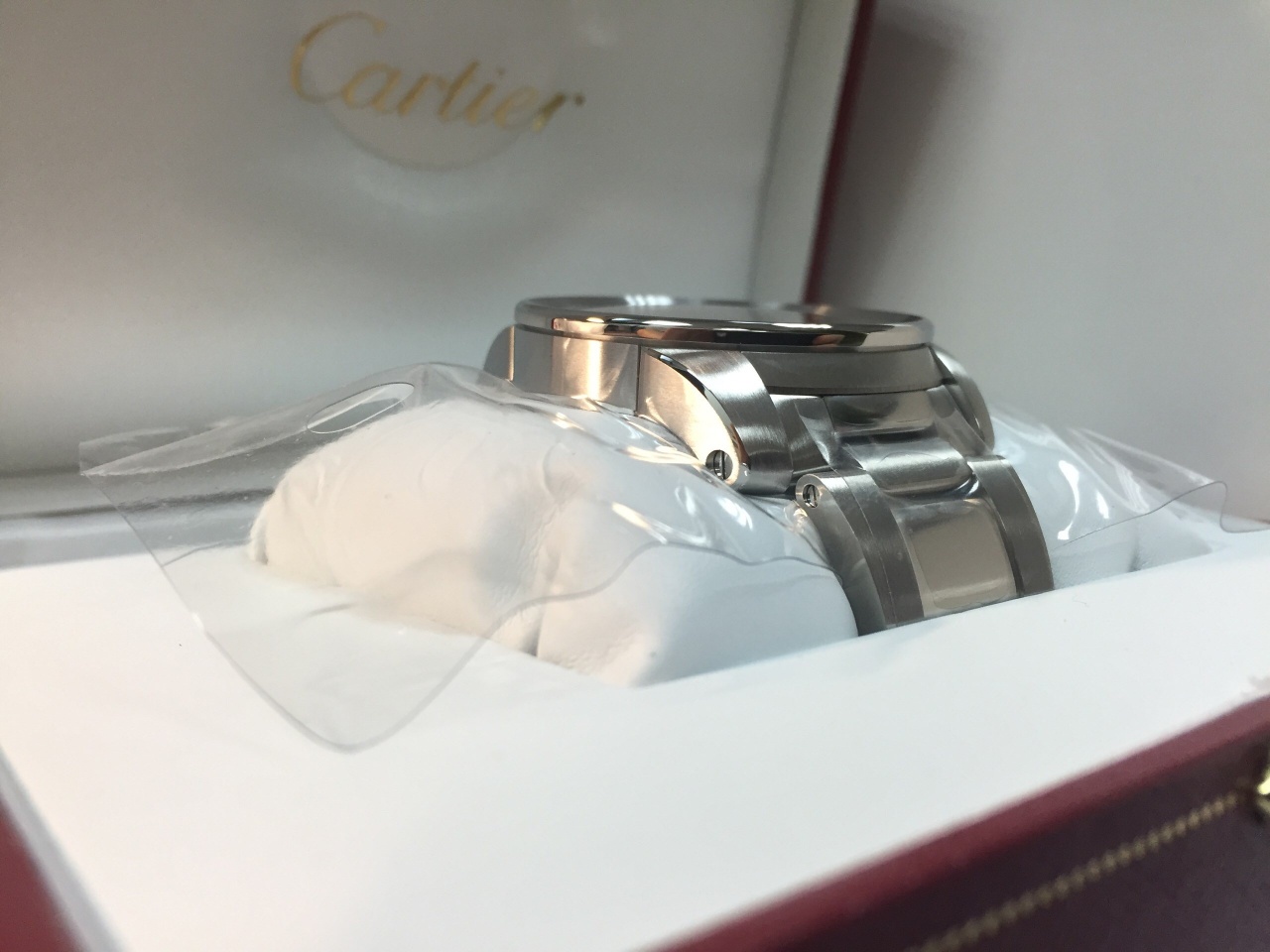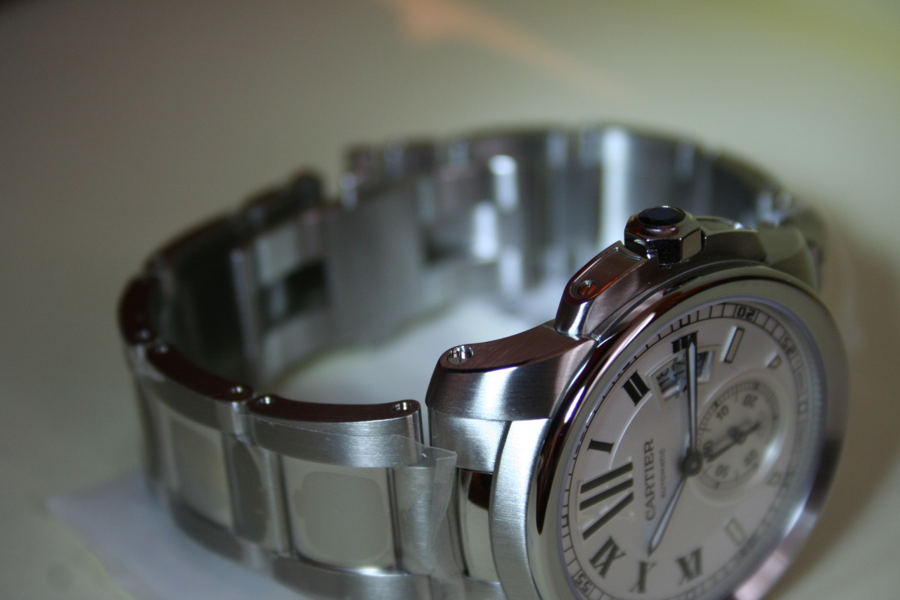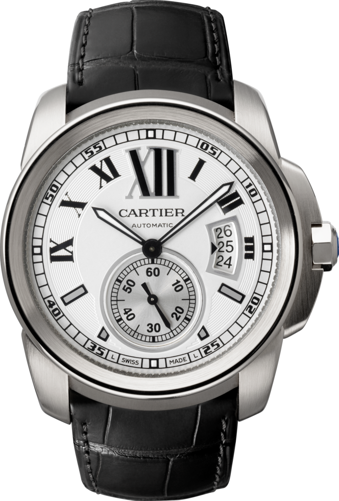 Очередная модель из коллекции Сalibre de Cartier от известного во всем мире производителя часов Cartier. Корпус этих часов довольно мощный,выполнен в круглой форме из нержавеющей стали. Основные функции: часы,минуты,секунды и дата. Индикатор даты находится на позиции 3х часов. Римские цифры, в сочетании с отлитыми вручную из вороненой стали люминесцентными черными стрелками, великолепно смотрятся на серебристом циферблате. Сапфировые стекла безеля и задней крышки защищают от царапин и прочих повреждений. Автоматический мех-м оснащен собственным мануфактурным калибром 1904-PS MS с запасом хода 48часов. Заводная головка украшена синей шпинелью.При желании, вместо браслета, также можно установить кожаный ремень.