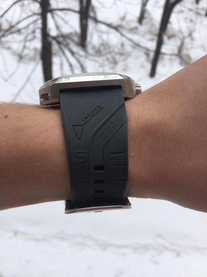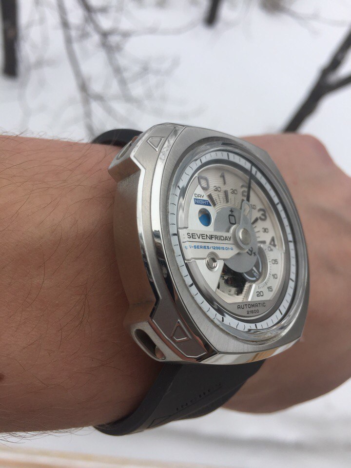 Мужская модель, время отображается при помощи дисков-сумматоров, вращающийся центральный диск "+0, +4, +8" выполняет функцию стрелки-метки, чтобы узнать, который сейчас час, необходимо прибавить значение диска "+0, +4, +8" к цифре на основной шкале, расположенной в положении между 11 и 3 часами, по такому же принципу работает секундный индикатор, находящийся в положении между 4 и 5 часами.