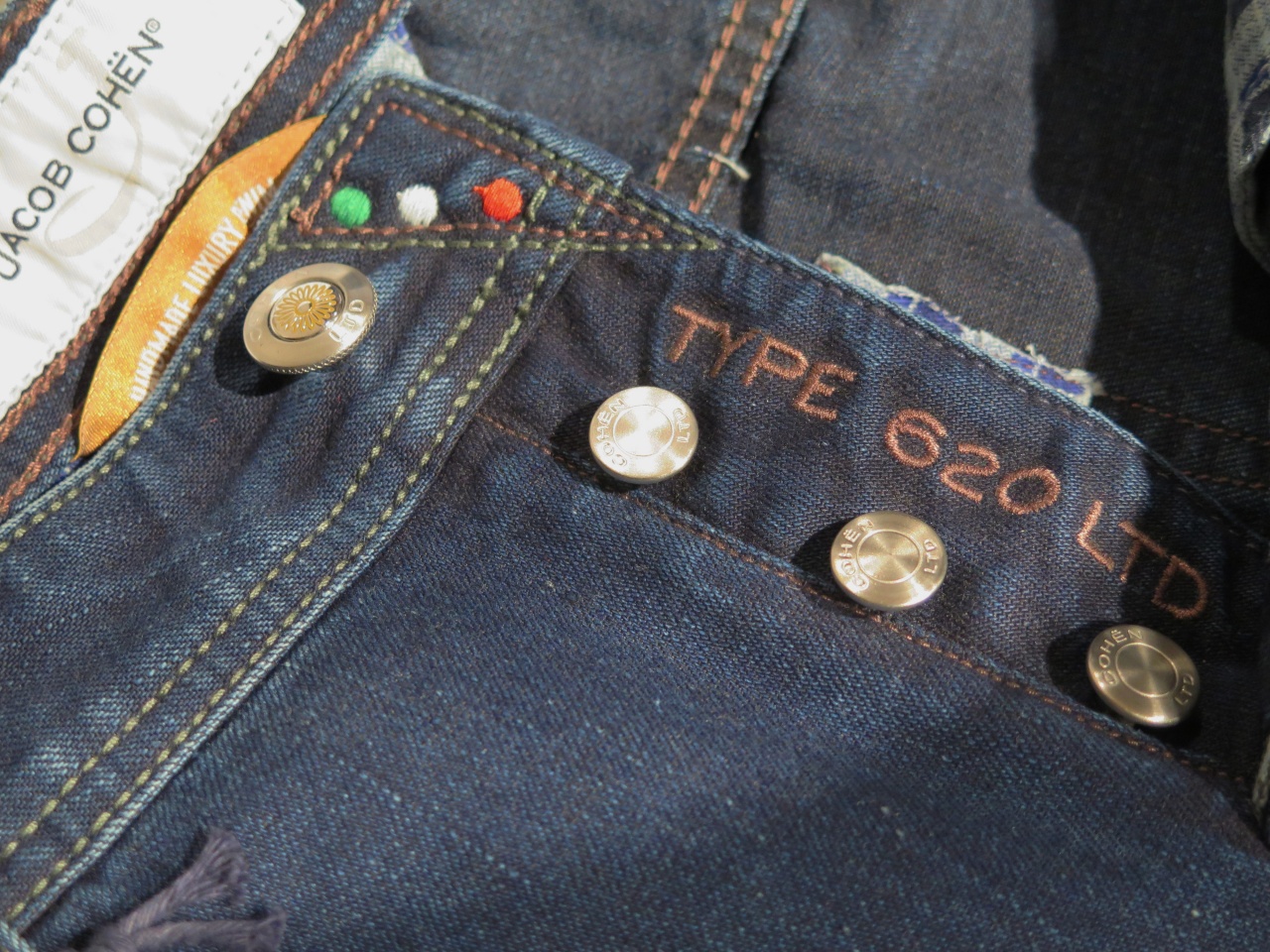 Сзади на правом бедре джинсы имеют фирменный ярлык из кожи пони коричневого цвета с логотипом марки Jасоb Соhёn, выполненный из металла, что указывает на принадлежность к "лимитированной" линейке марки и порядковый номер - 173 из 386!!!