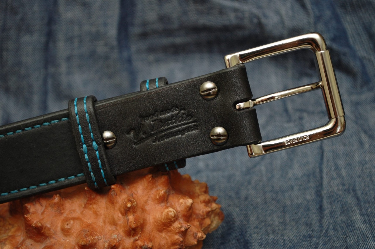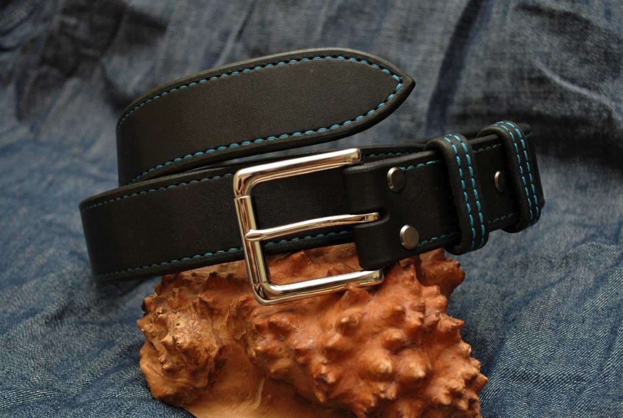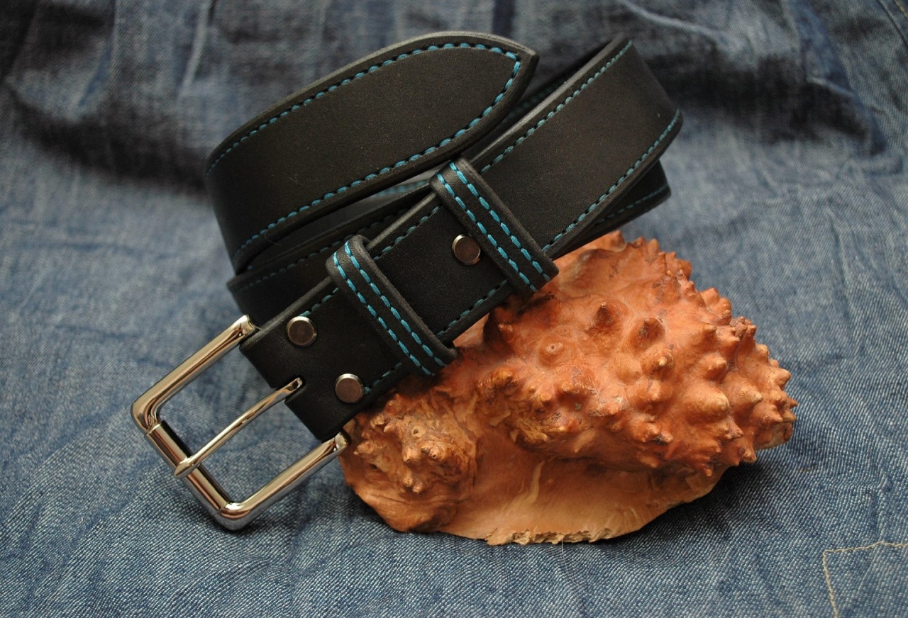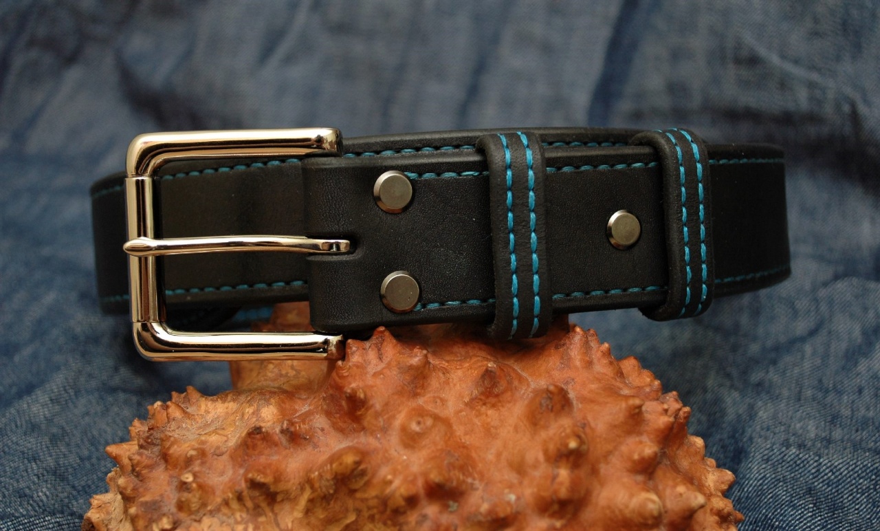 Ремень полностью прошит вручную седельным швом капроновой плетёной нитью толщиной 1 мм. Нить утоплена в канавку по всему периметру, что полностью исключает её перетирание в процессе носки.