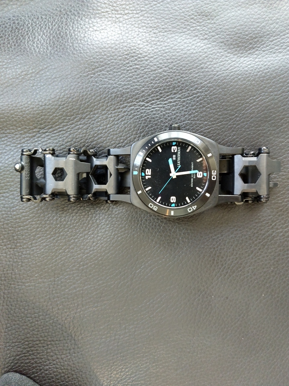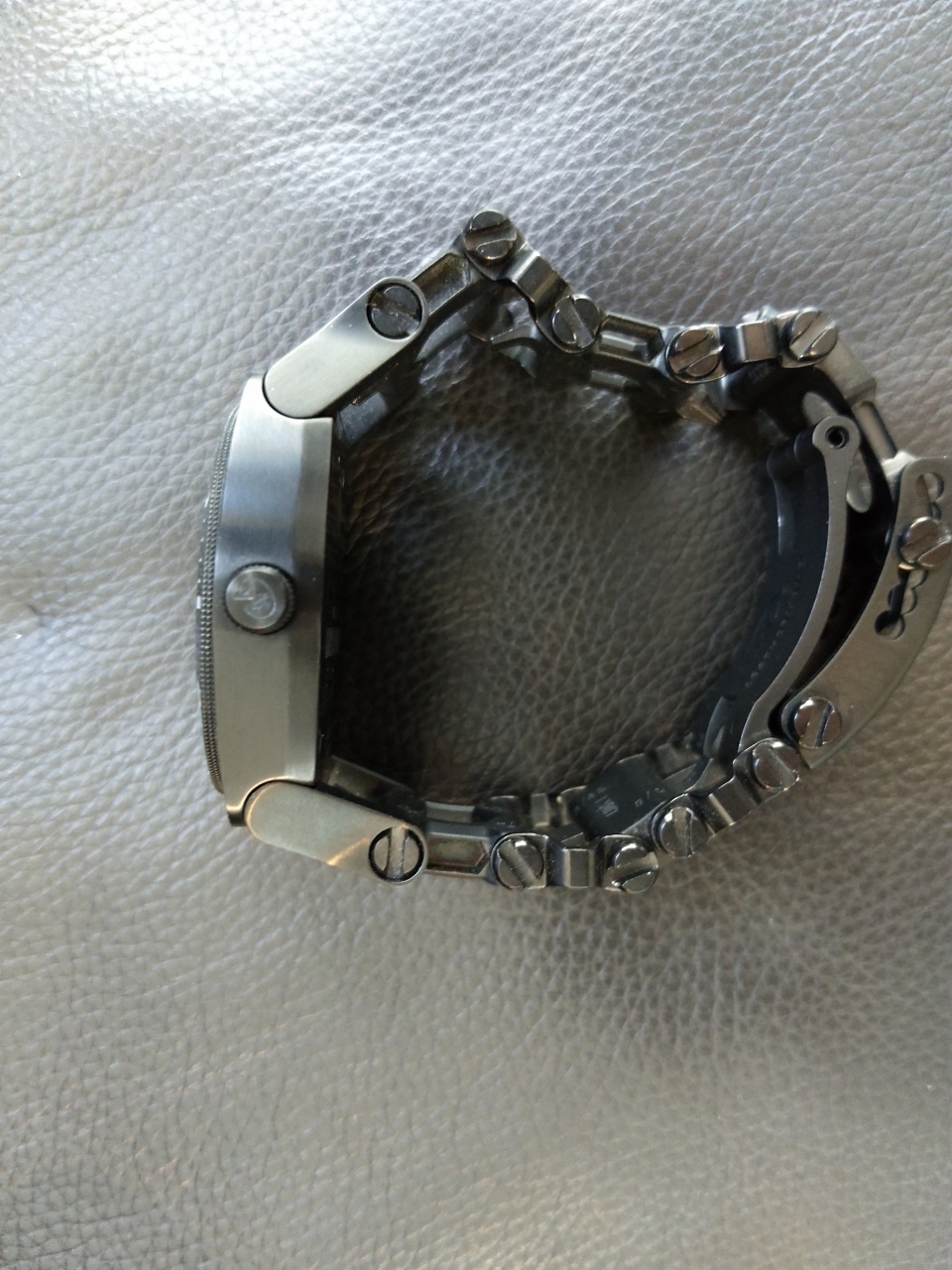 Имеет чуть заметные следы естественного износа на браслете и один недостаток: на одном из звеньев сорвана одна резьба. Вследствие этого винт в резьбе залит эпоксидкой и звено хранится как запасное, это звено можно также поставить, а можно проийтись метчиком и подобрать винт, но мне это не нужно. Можно также и купить отдельно звено у производителя, если очень надо.