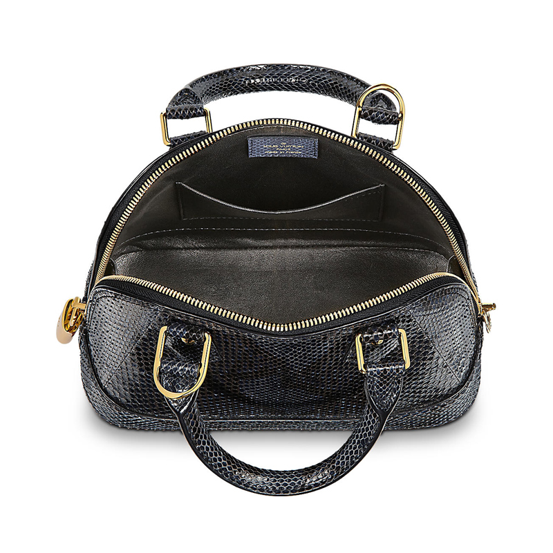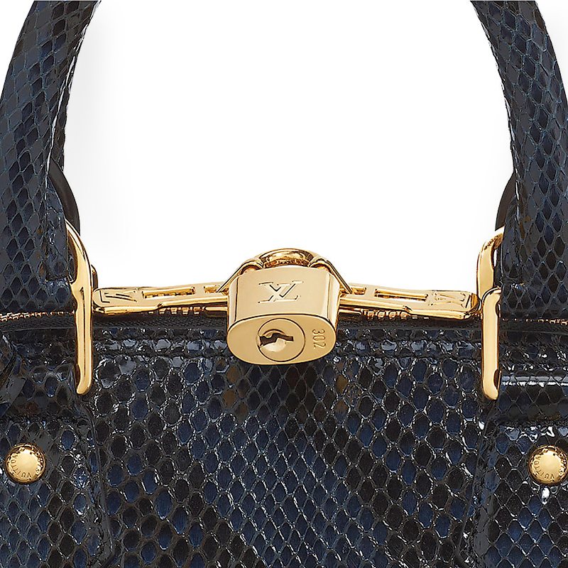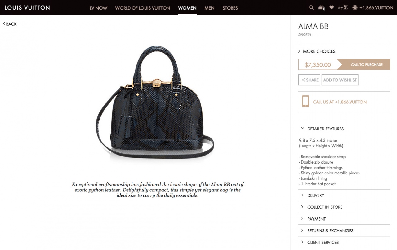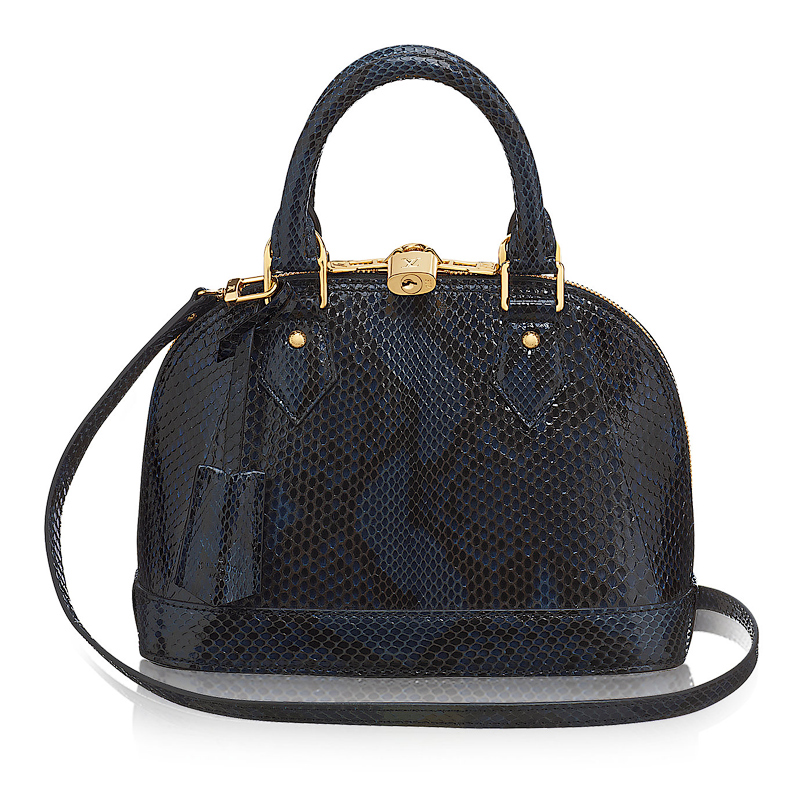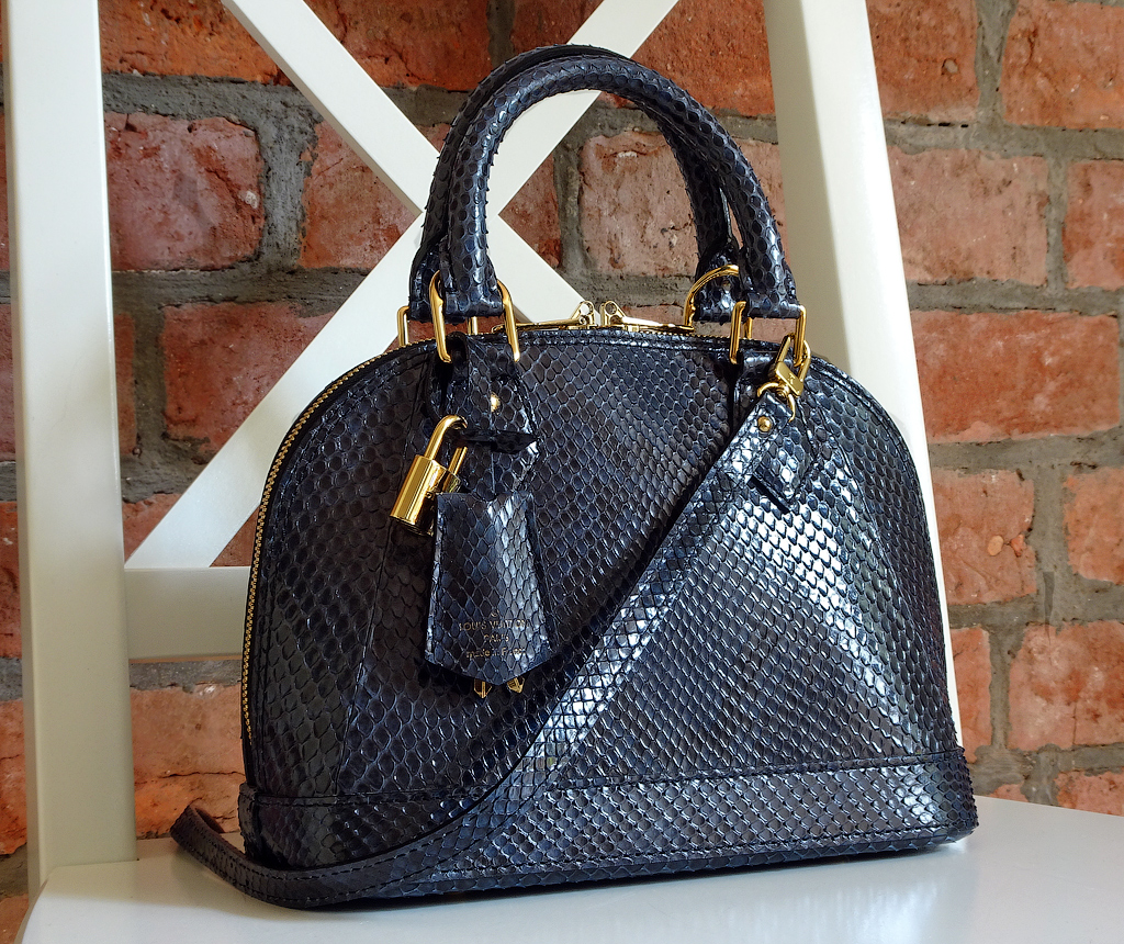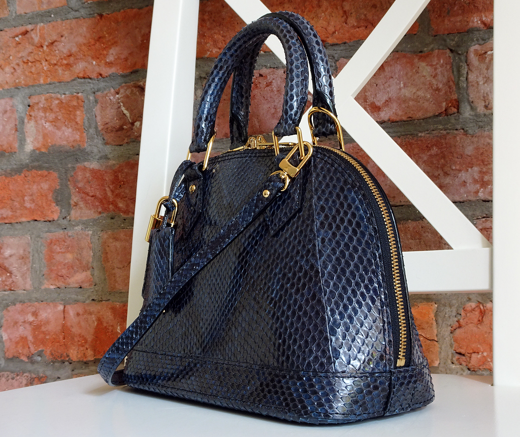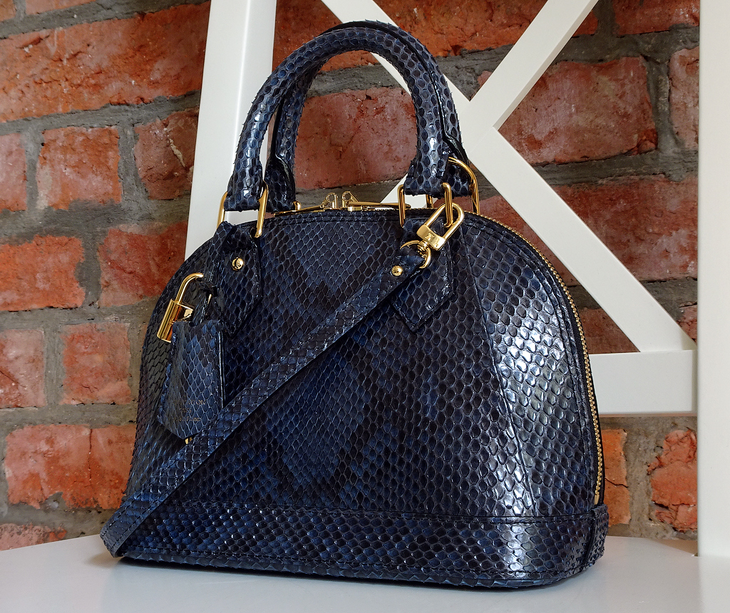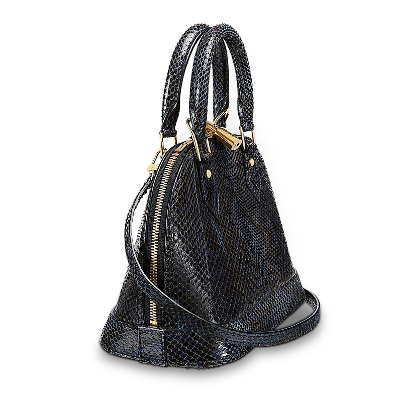 "Роскошная кожа питона идеально подходит для эксклюзивной версии компактной модели Alma BB. В этой культовой сумке Дома сочетаются женственность и элегантность. Очаровательная сумка Alma BB - родственница сумки Alma, иконы стиля Арт Деко, созданной в 1934 году. Ее создателем был Гастон Вюиттон, который назвал ее в честь моста Альма, объединяющего два фешенебельных квартала Парижа. Миниатюрная и невероятно изящная версия сумки легко вмещает ключи, кошелек, телефон и помаду. Длинный ремешок позволяет носить Alma BB на плече, оставляя руки свободными."