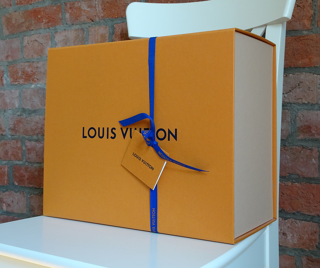 Сумка в подарочной упаковке Louis Vuitton в новом стиле - рыжего цвета с синей лентой.