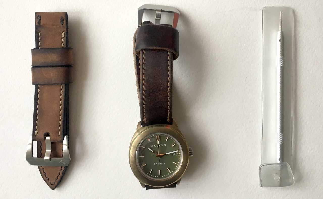В комплекте коробка, гарантийная карточка (гарантия истекла). Документ в виде инструкции не сохранился. Запасной ремешок ручной работы. Отвёртка для замены ремня.