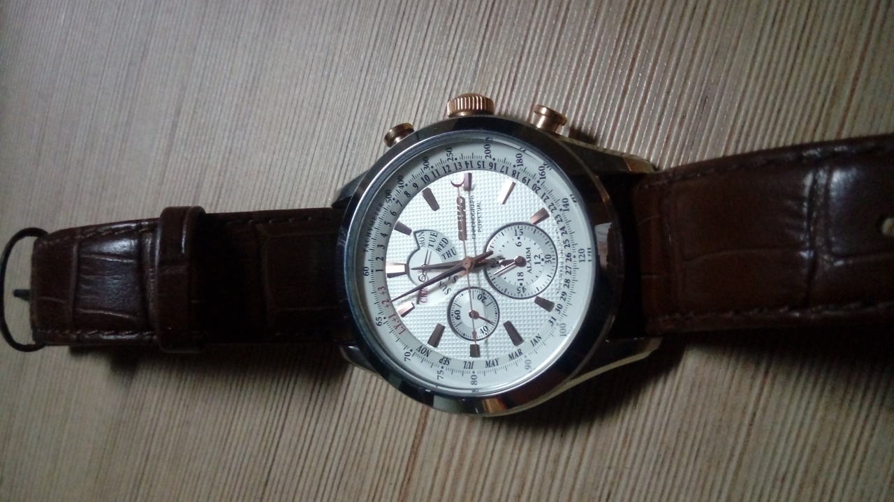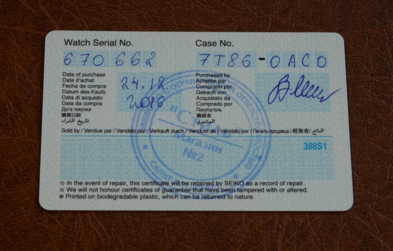 Полный комплект - документы, коробка, кроме внешней картонной белой оболочки с надписью Seiko (сильно помята и с лишними надписями). На ремне естественные следы носки, но можно еще долго носить.