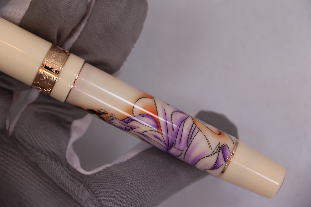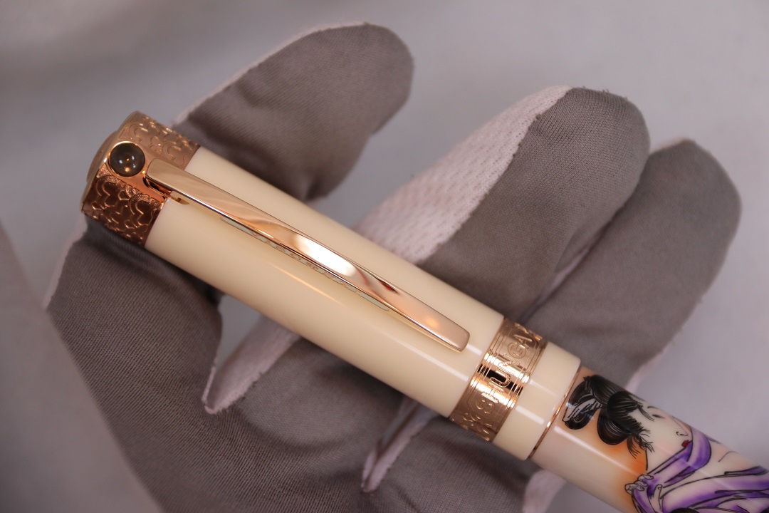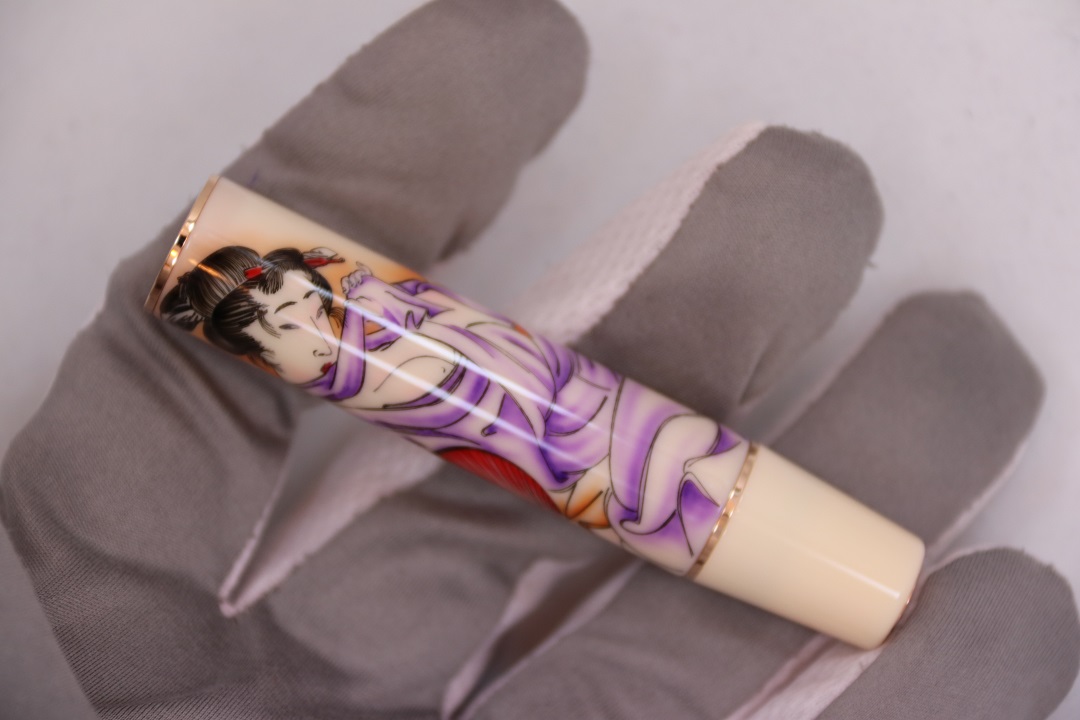 Изображение двух влюбленных в стиле сюнга на барреле ручки, вторая картинка с изображением двух любовников находится на внутренней части корпуса, а для любителей подглядывать еще одна эротическая картинка размещена в замочной скважине в колпачке.