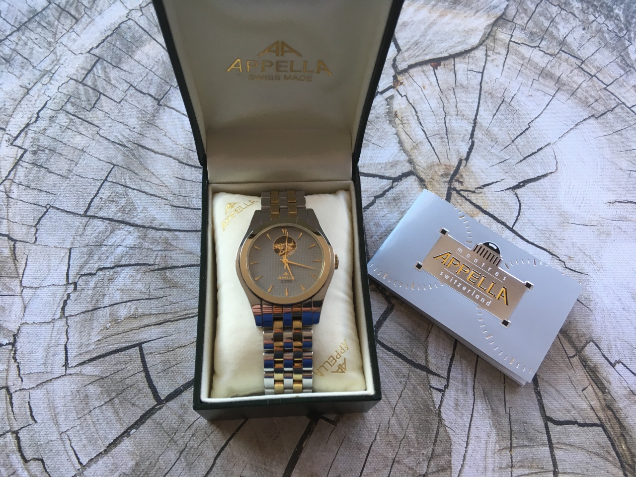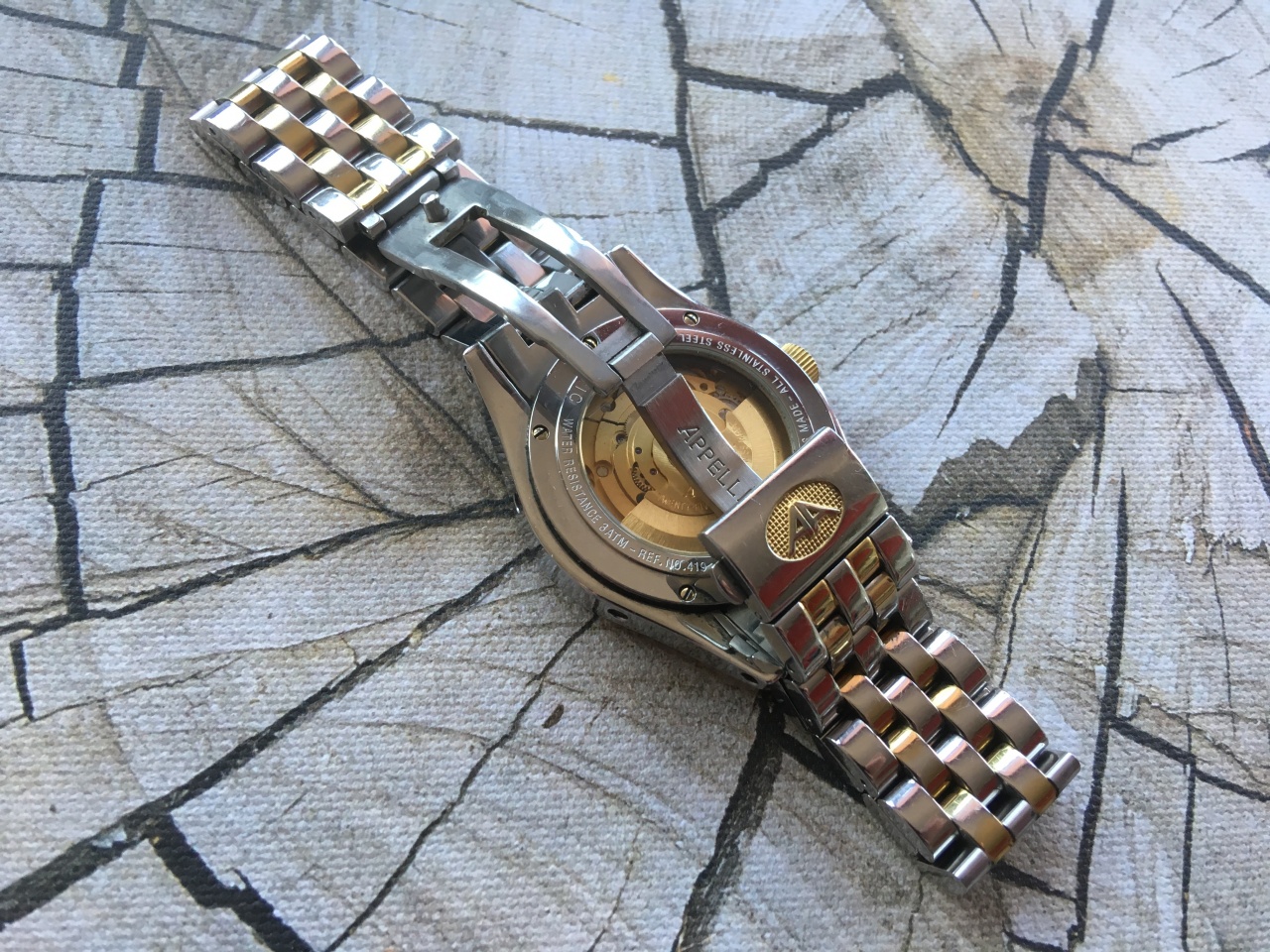 Швейцарские часы Appella 419-2003 с автоматическим механизмом ЕТА 2824/2 (25 камней, запас хода 42ч, частота полуколебаний баланса 28800 полуоб/час.). Противоударное устройство оси баланса Incabloc. Устройство стабилизации Etachron. Прозрачная задняя крышка. Автоподзавод. Центральная секундная стрелка. • Корпус из высококачественной нержавеющей с PVD покрытием. • Сапфировое стекло. • Браслет из нержавеющей с PVD покрытием. • Водозащита 5 АТМ. Размер с учетом заводной головки и ушками 41х48 мм.
