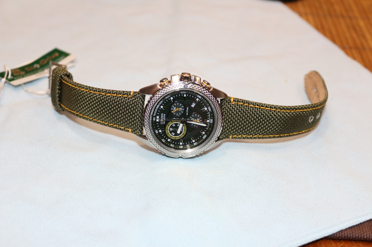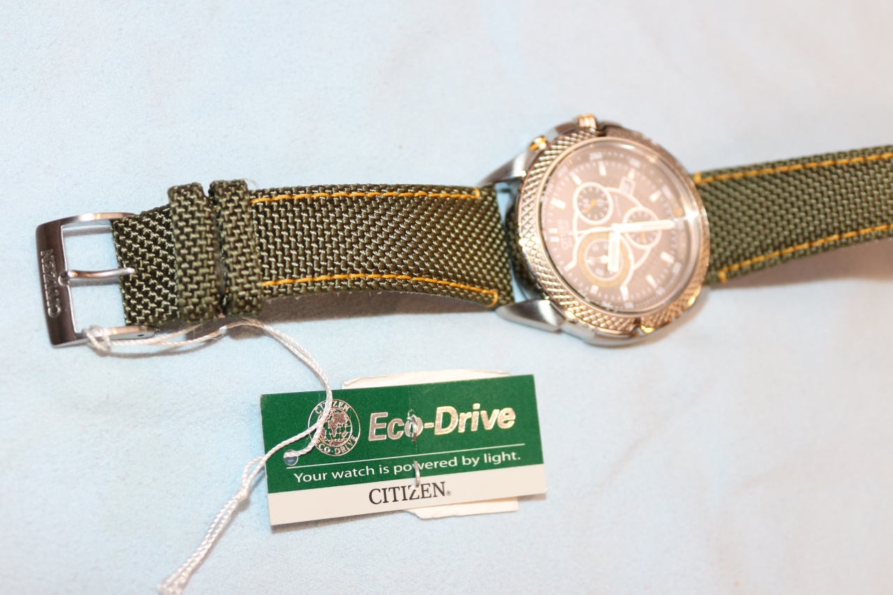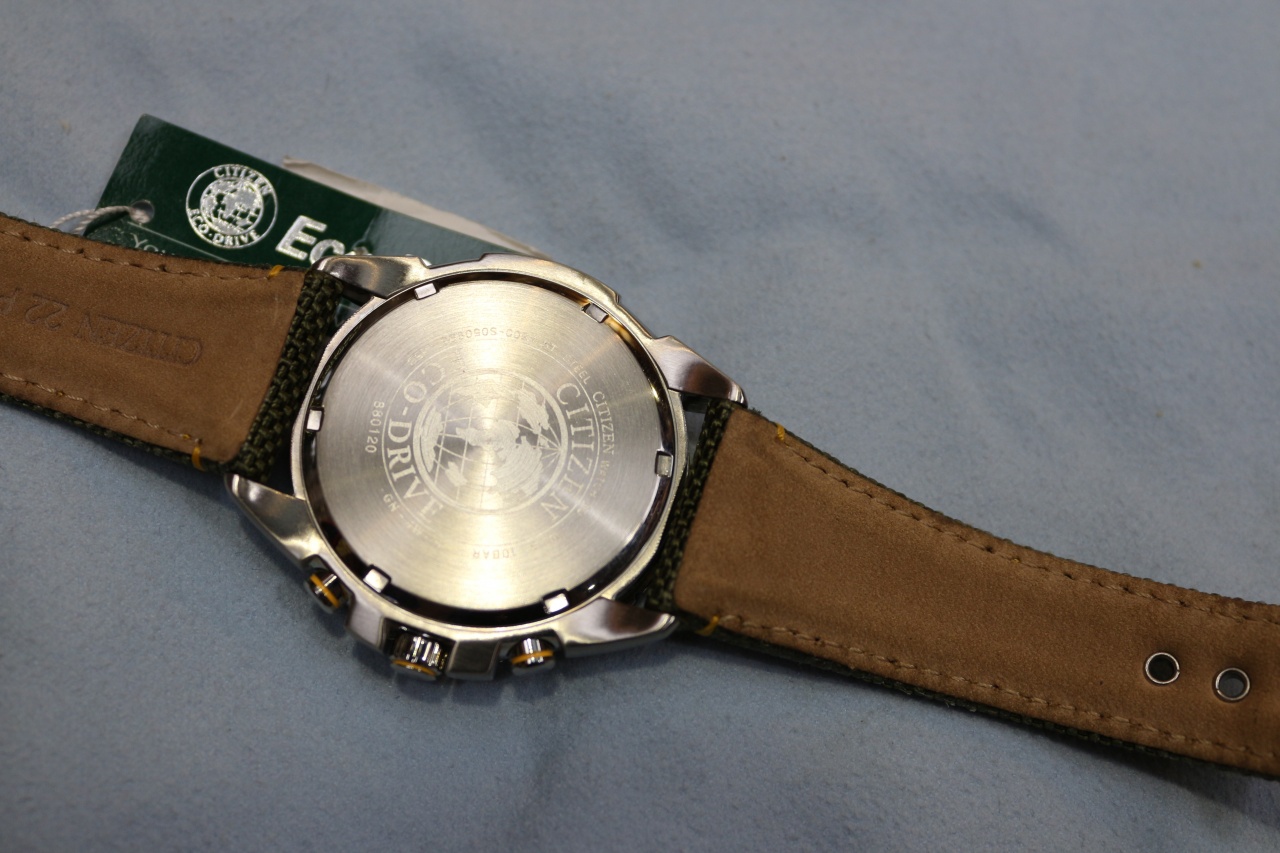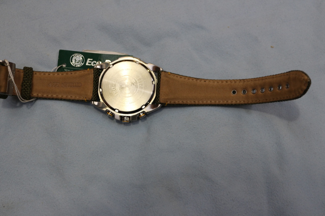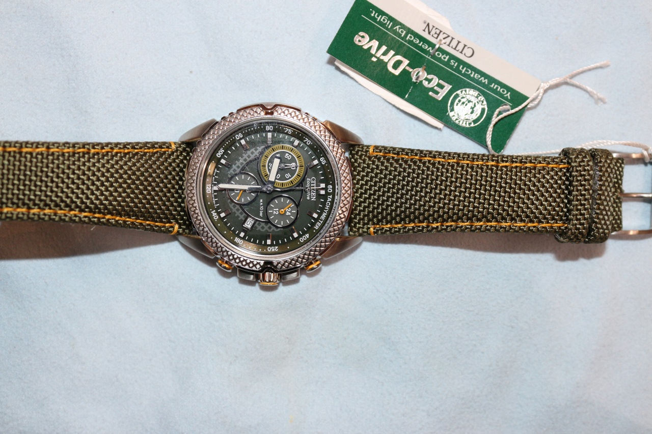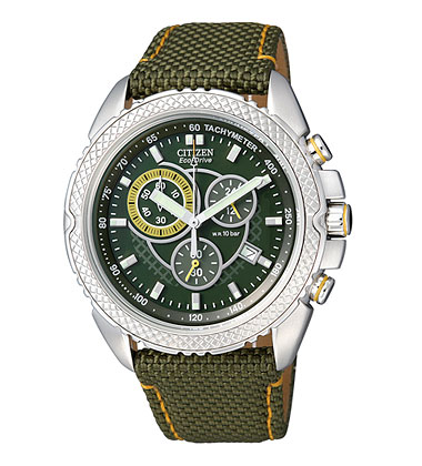 Кварцевый хронограф с суточным индикатором калибр H500 оснащенный системой питания и подзарядки от солнечного света ECO-DRIVE. • Смещенная секундная стрелка (6 часов). Окошко даты. • Стрелочный индикатор времени суток (2 часа). • Центральная секундная стрелка хронографа, циферблат накопителя на 60 минут в положении 10 часов. • Система ECO-DRIVE - патентованная технология CITIZEN заключающаяся в размещении фотоэлементов скрытых под циферблатом и постоянно подзаряжающих аккумулятор часов. Продолжительность работы после полной зарядки аккумулятора при последующем хранении в темноте - 5 месяцев. Система предупреждения о низком уровне заряда аккумулятора за 120 часов до критического уровня. • Точность хода: не хуже +/-15 секунд в месяц. • Диапазон пригодных для использования температур -10...+60C. • Диаметр корпуса 40 мм. • Ширина ремешка 22 мм. • Минеральное стекло устойчивое к возникновению царапин. • Корпус из высококачественного стального сплава 316L с высокими антикоррозийными свойствами. • Тахометрическая шкала. • Водозащита до 10 АТМ. • Комбинированный кожаный/тканевый ремешок.